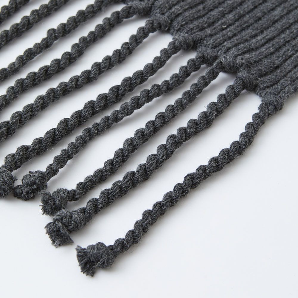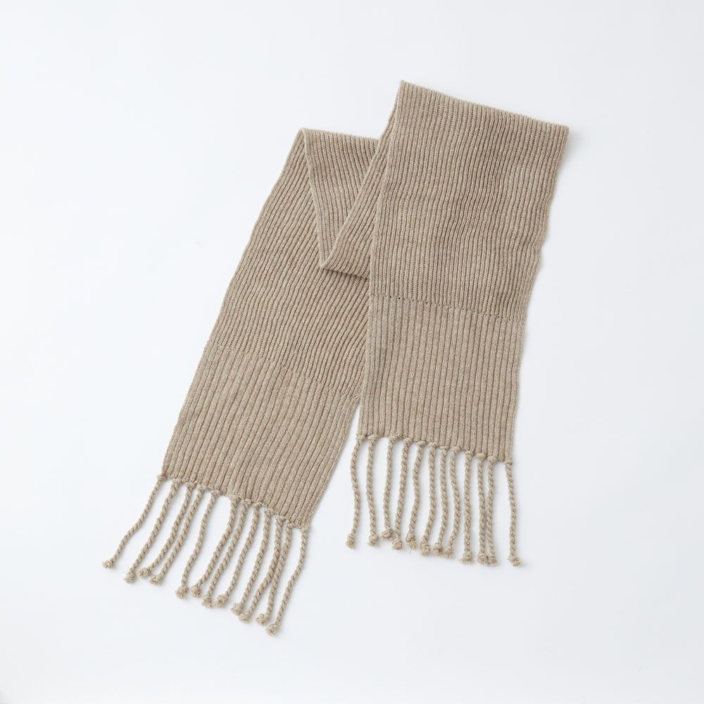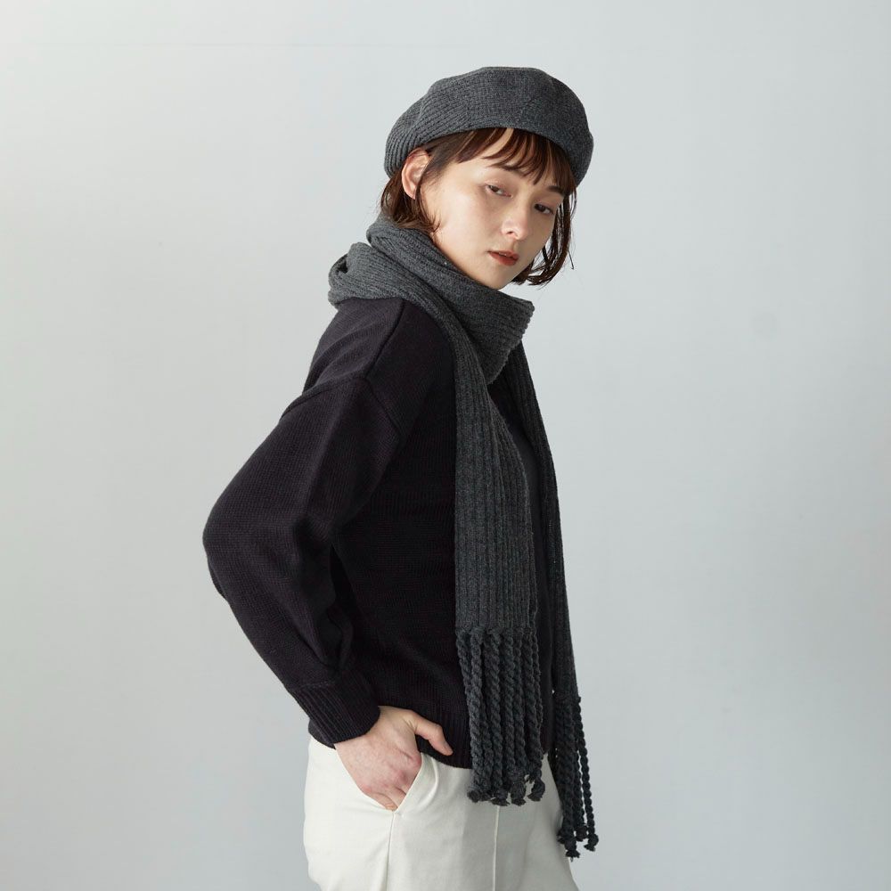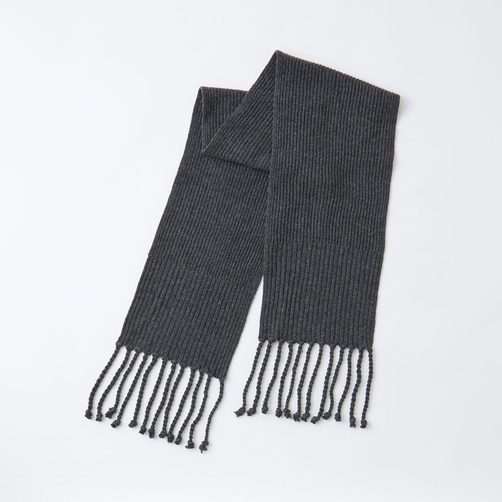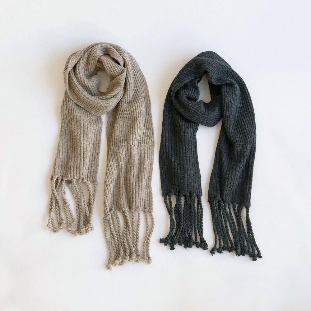 寒い時期に大活躍のリブ編みマフラーは、巻いた時に美しい微妙なニュアンスを表現するため、2目ゴム編みとイギリスゴム編み、2種類のリブ編みを採用しています。しっかりボリュームがあり、太めの長いフリンジが特徴です。柔らかいニット生地で首あたりも◎巻くだけでおしゃれに決まります。