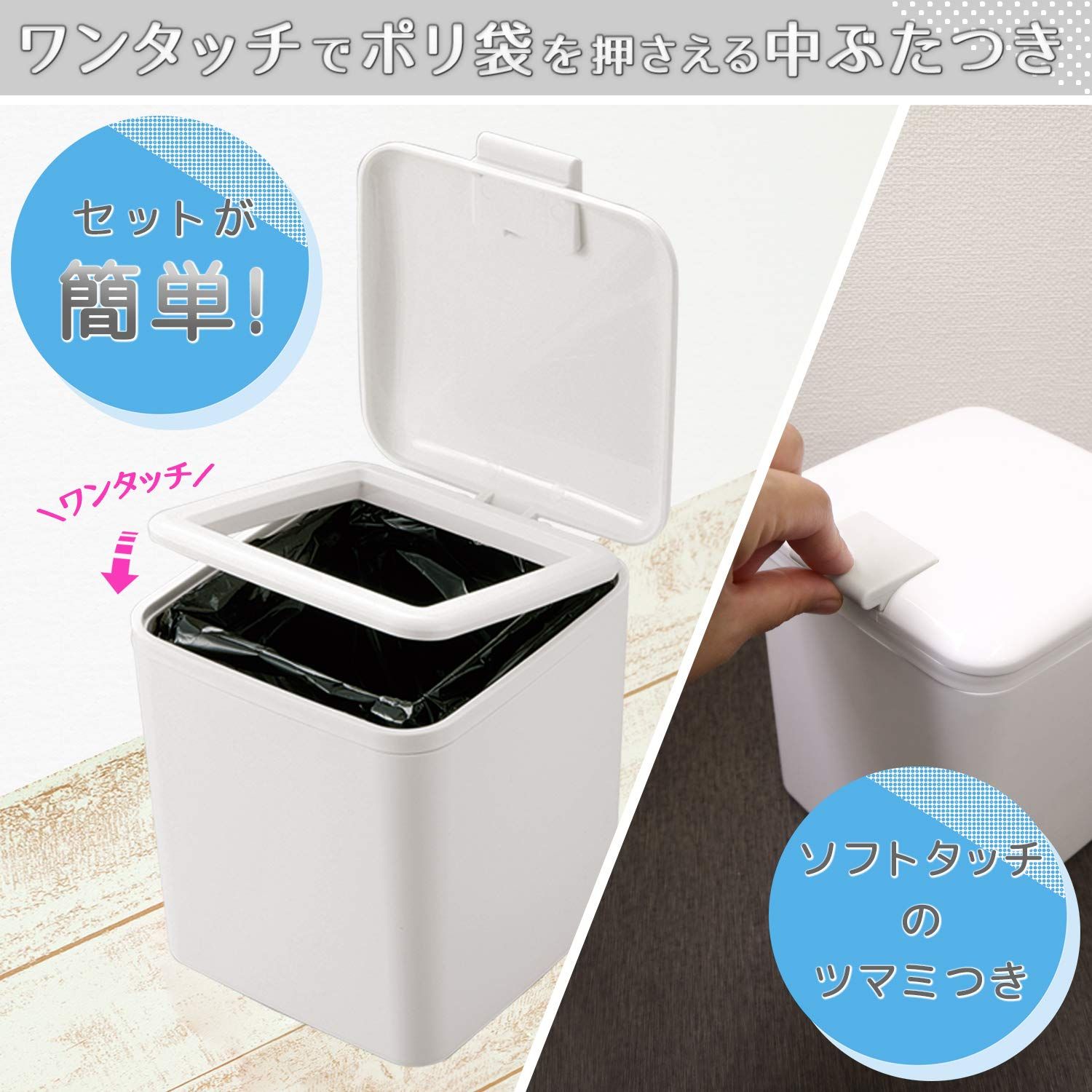ワンタッチでポリ袋を押さえる中ブタがついているので