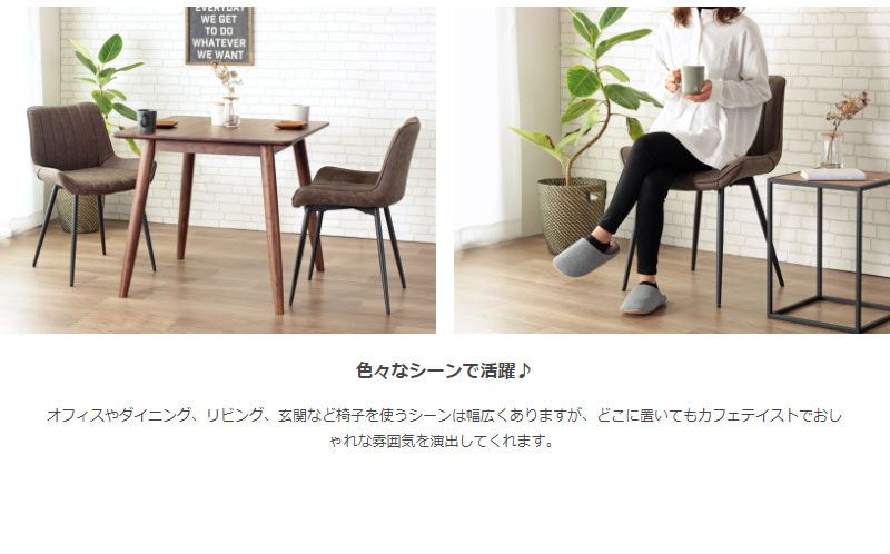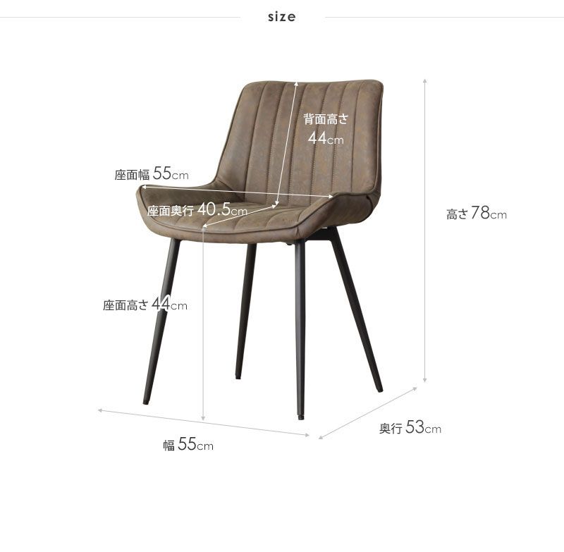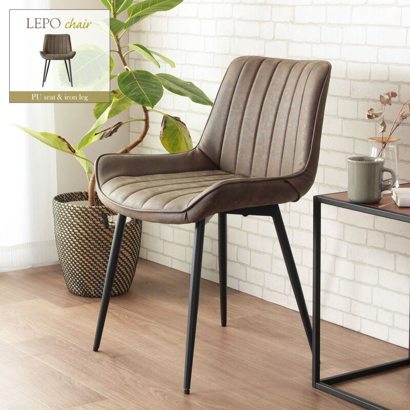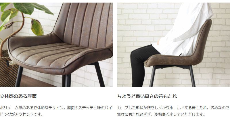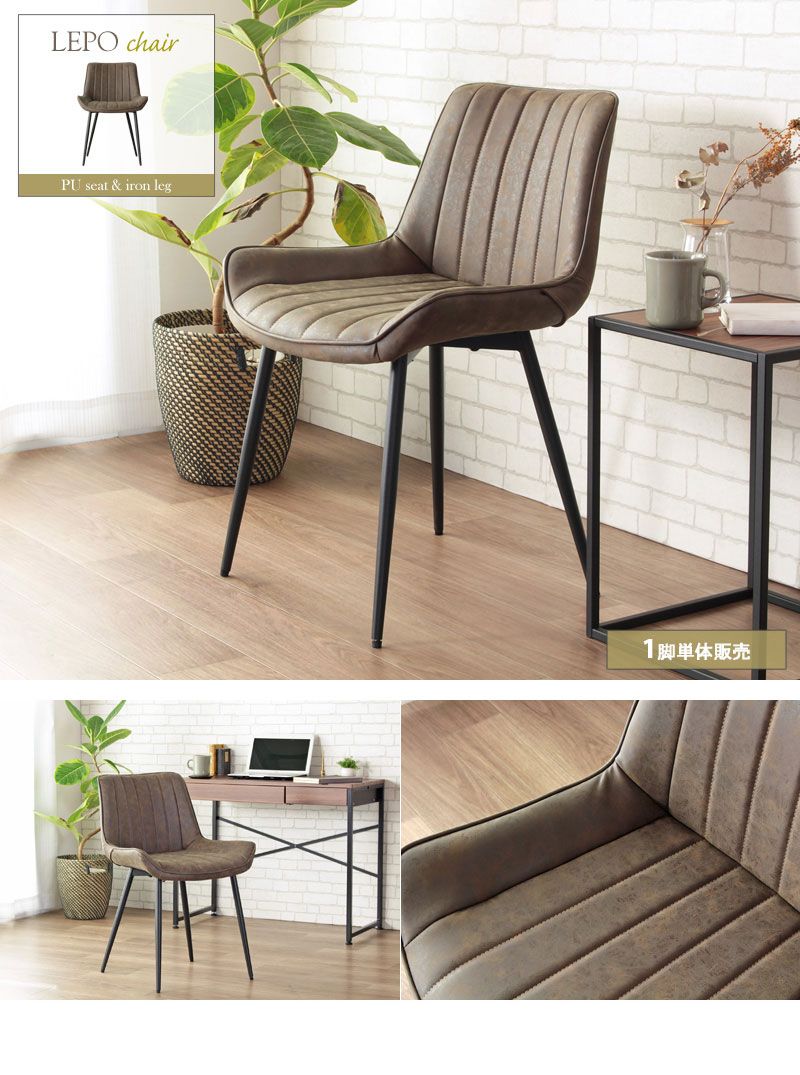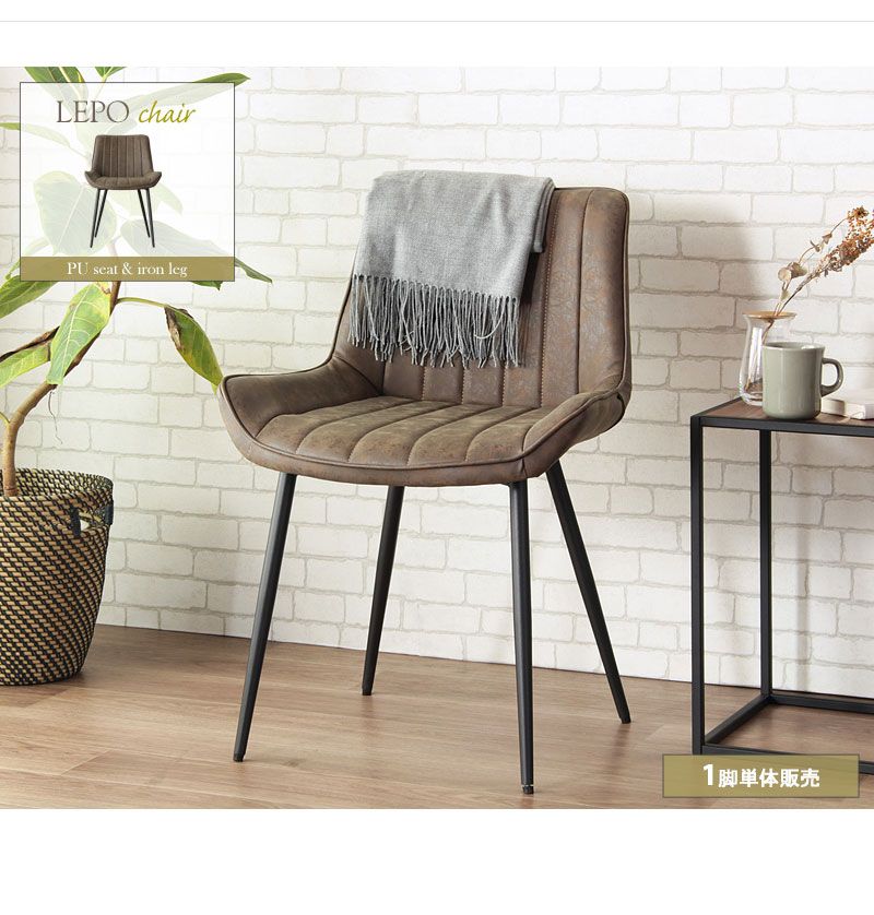 ゆったりした立体感のある座面が身体にフィット。味のあるヴィンテージなデザインチェア。ゆったりとした広めの座面とふっくらした柔らかなクッションが、包み込むようなフィット感を生み出すデザインチェア。味のある風合いを再現したヴィンテージ風のPUレザーの座面を、スリムなブラックスチール脚と組み合わせ、全体の印象をすっきりと引き締めます。ダイニングチェアにありがちな2脚セットではなく、必要に応じて1脚からお買い求めいただける単品販売。単体での使用はもちろん、デスクやダイニングテーブルとのコーディネイトで、カフェの様な落ち着きのある空間を作りだします。サイズ本体:幅55×奥行53×高さ78座面:幅55×奥行40.5×高さ44cm背もたれ:高さ32cm素材座面:PU、合板、ウレタン脚部:天然木、ラッカー塗装脚部:スチール、粉体塗装仕様カラー:ヴィンテージブラウンお客様組立品[※付属の六角レンチで組立可]●●