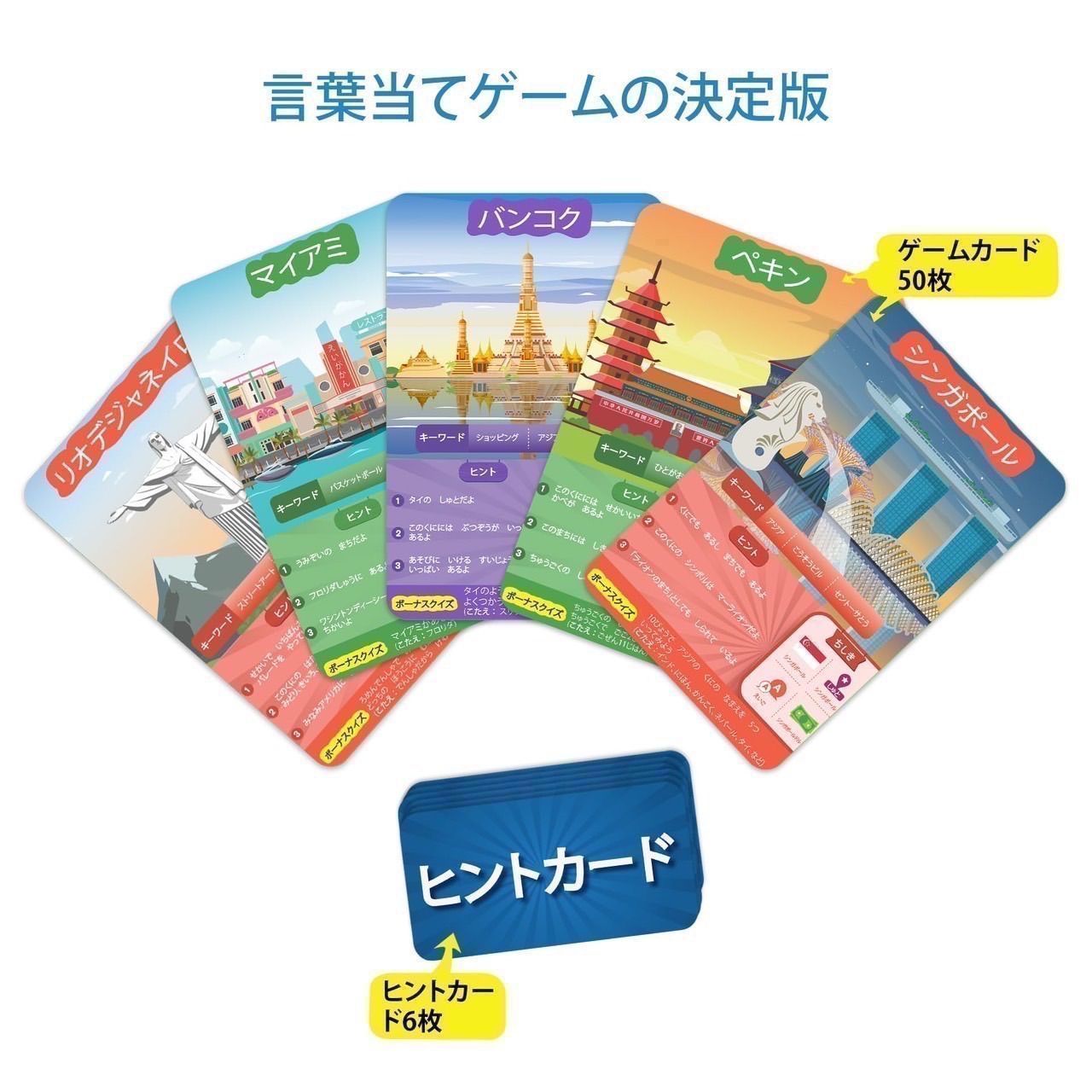 質問ゲーム: ゲーム カードに書かれた国に関する 10 個の質問に回答します。都市はアジアにありますか? 観光地ですか? 国の首都ですか? よく考えて賢く質問し、ヒント カードを賢く使用してください。最初に 7 枚のゲーム カードを集めた人が勝者になります。