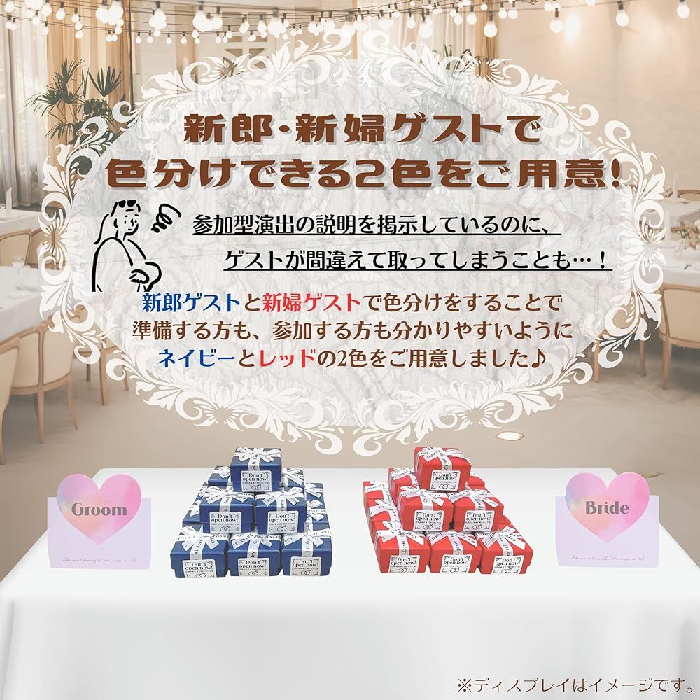 【数合わせ用の単色セット】準備する際や配る際にわかりやすいように、新郎側と新婦側ゲストで色分けができる、赤色と紺色の2色のリングBOXを取り扱っています!ゲストの数合わせに、こちらの単色セットが最適です♪