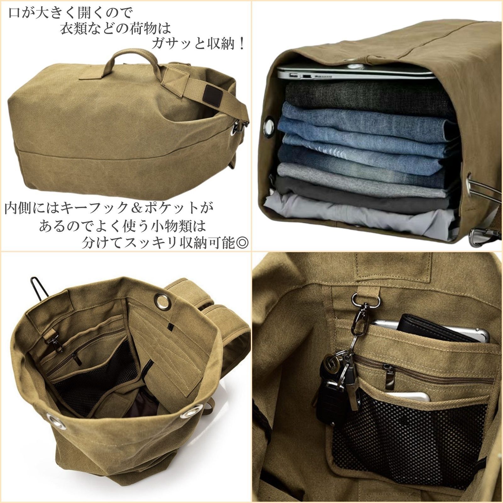 開口部が大きく開くので荷物の出し入れがしやすく、中には便利な小物ポケットがあるのでよく使う物は分けて収納可能です。