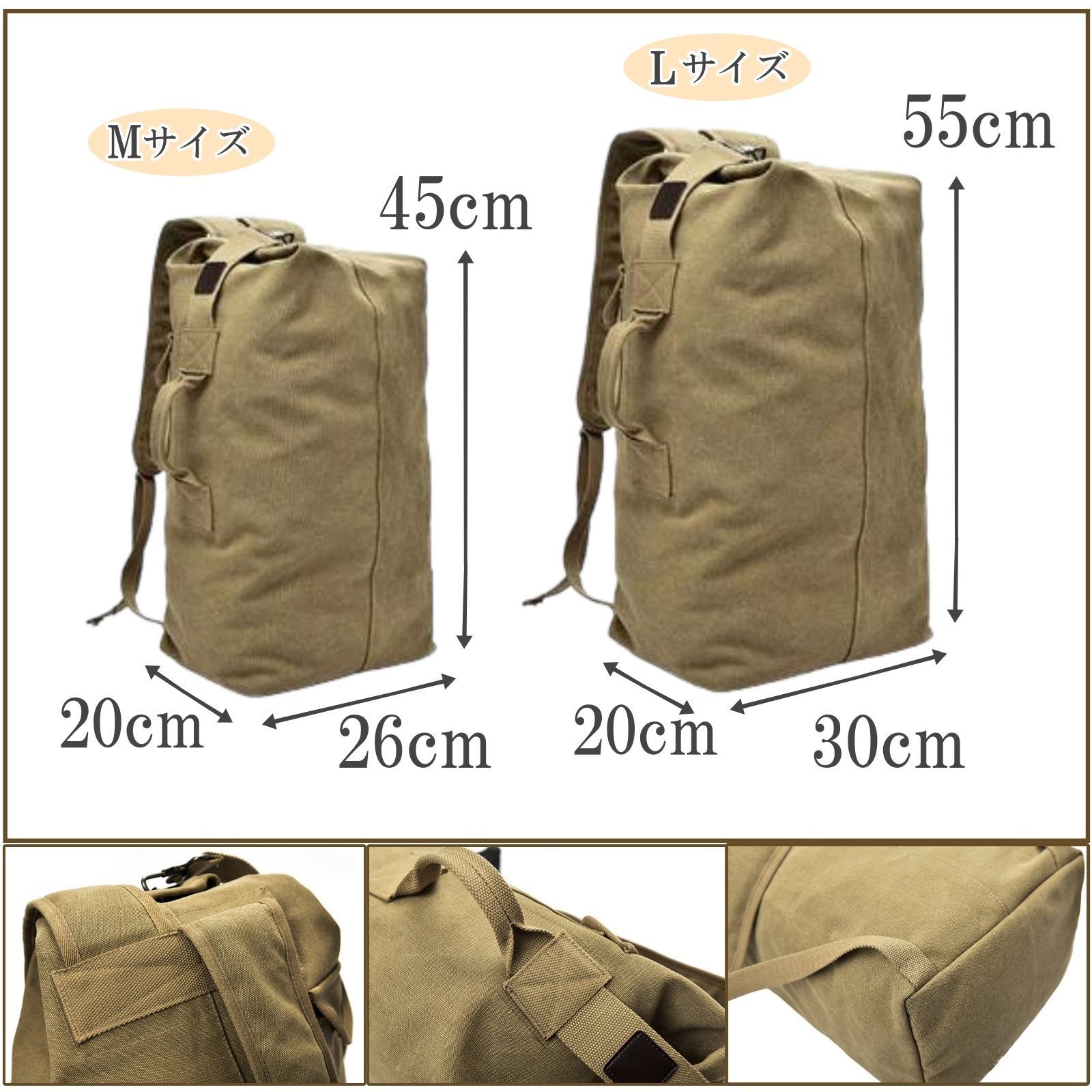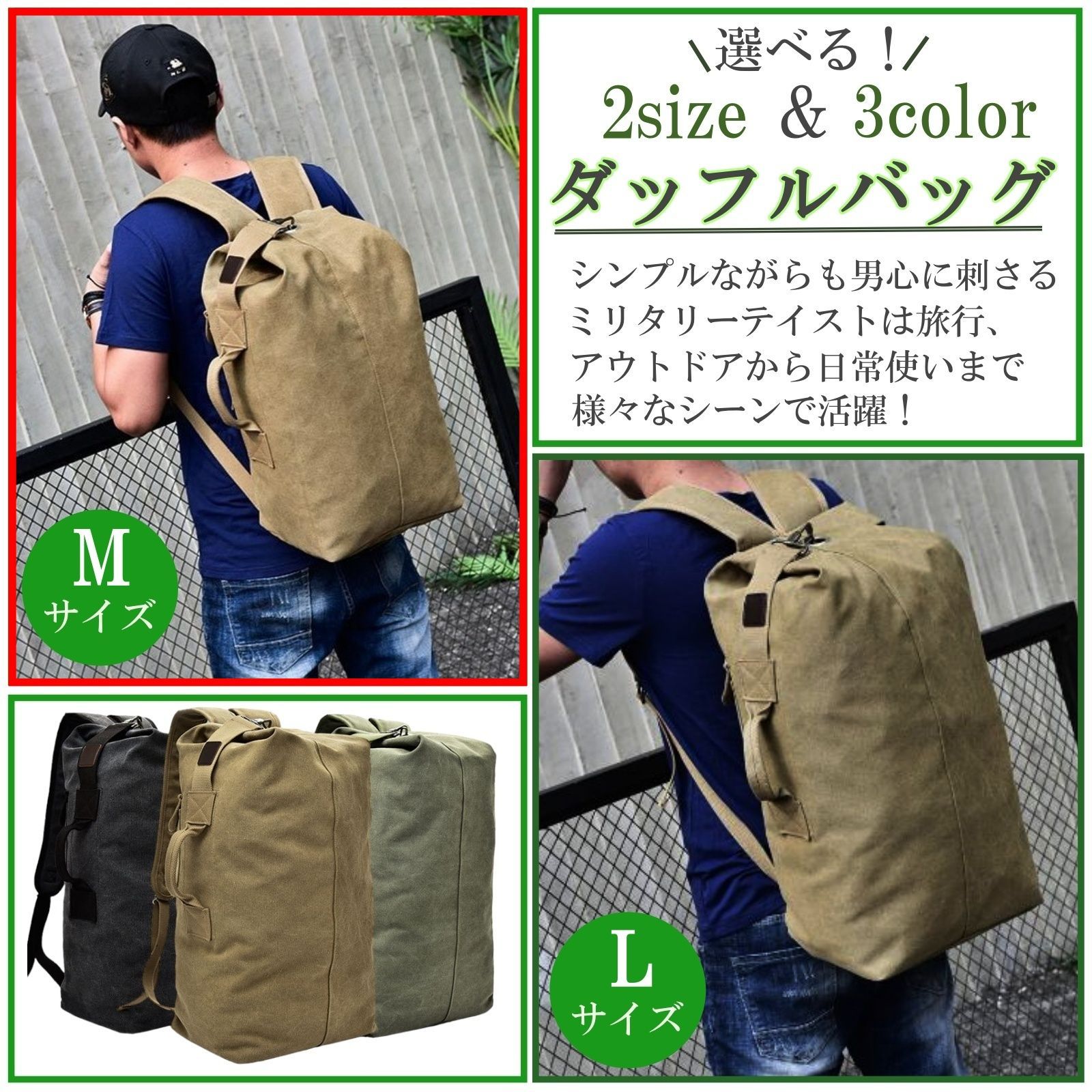 Lサイズは旅行やアウトドアなど荷物が多いときに、Mサイズは日常使いに丁度良いサイズ感。