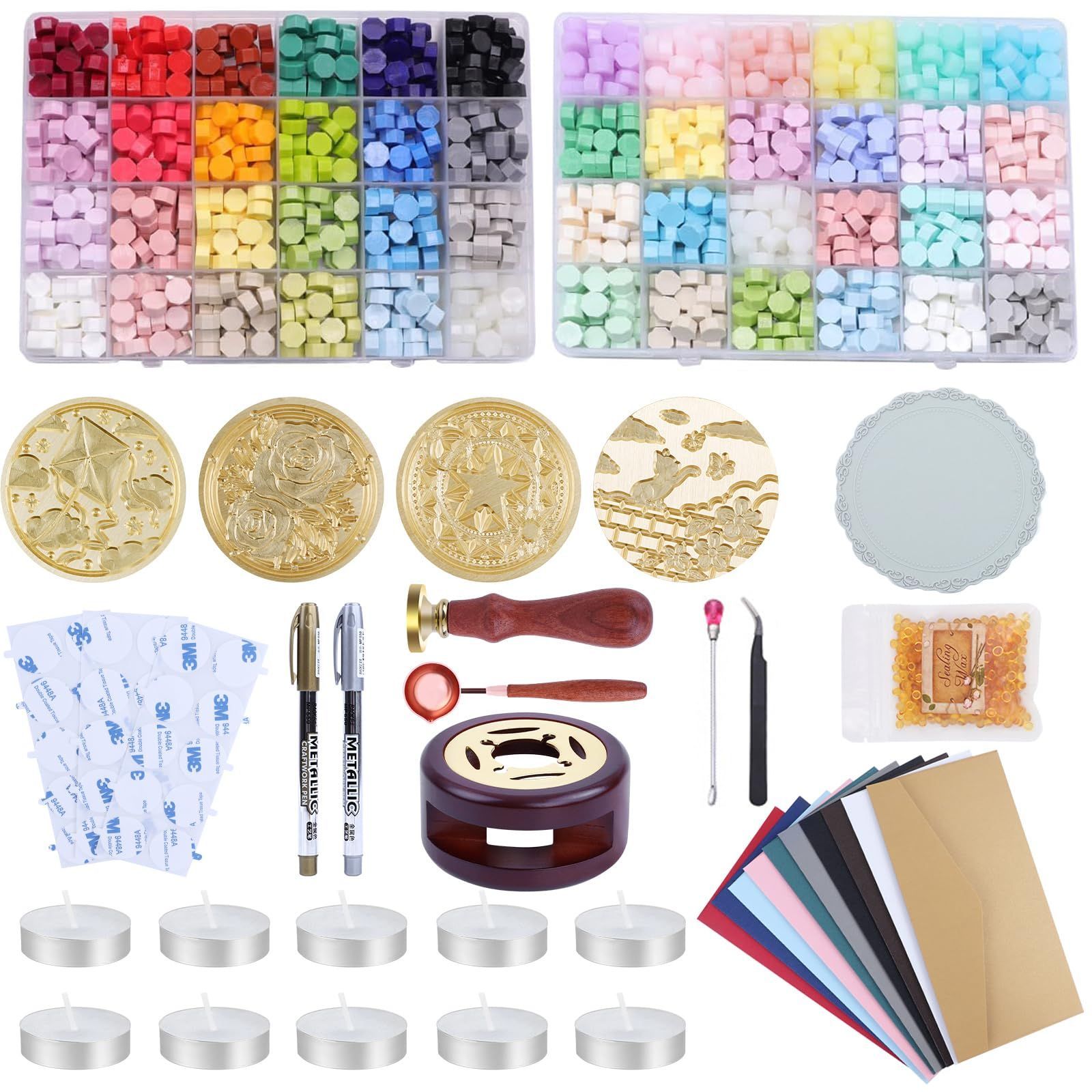 OIENNI シーリングワックスセット シーリングスタンプ 蝋封 48色 約1200個 ワックス炉+スプーン+キャンドル+スタンプ+スタンプ台+両面シール+封筒付き 手紙/招待状/告白/祝い/DIY装飾に適用 (ワックスセット)