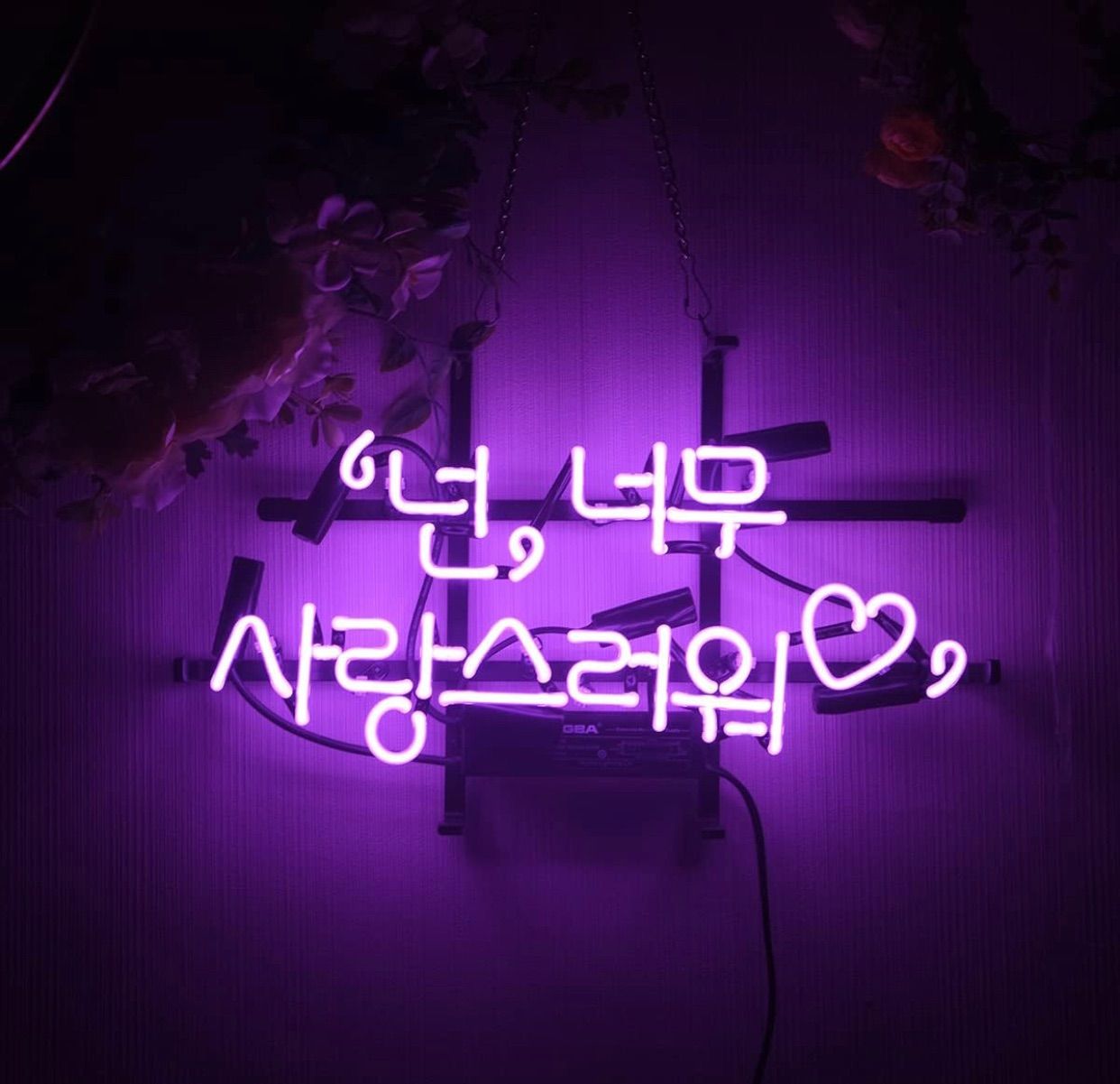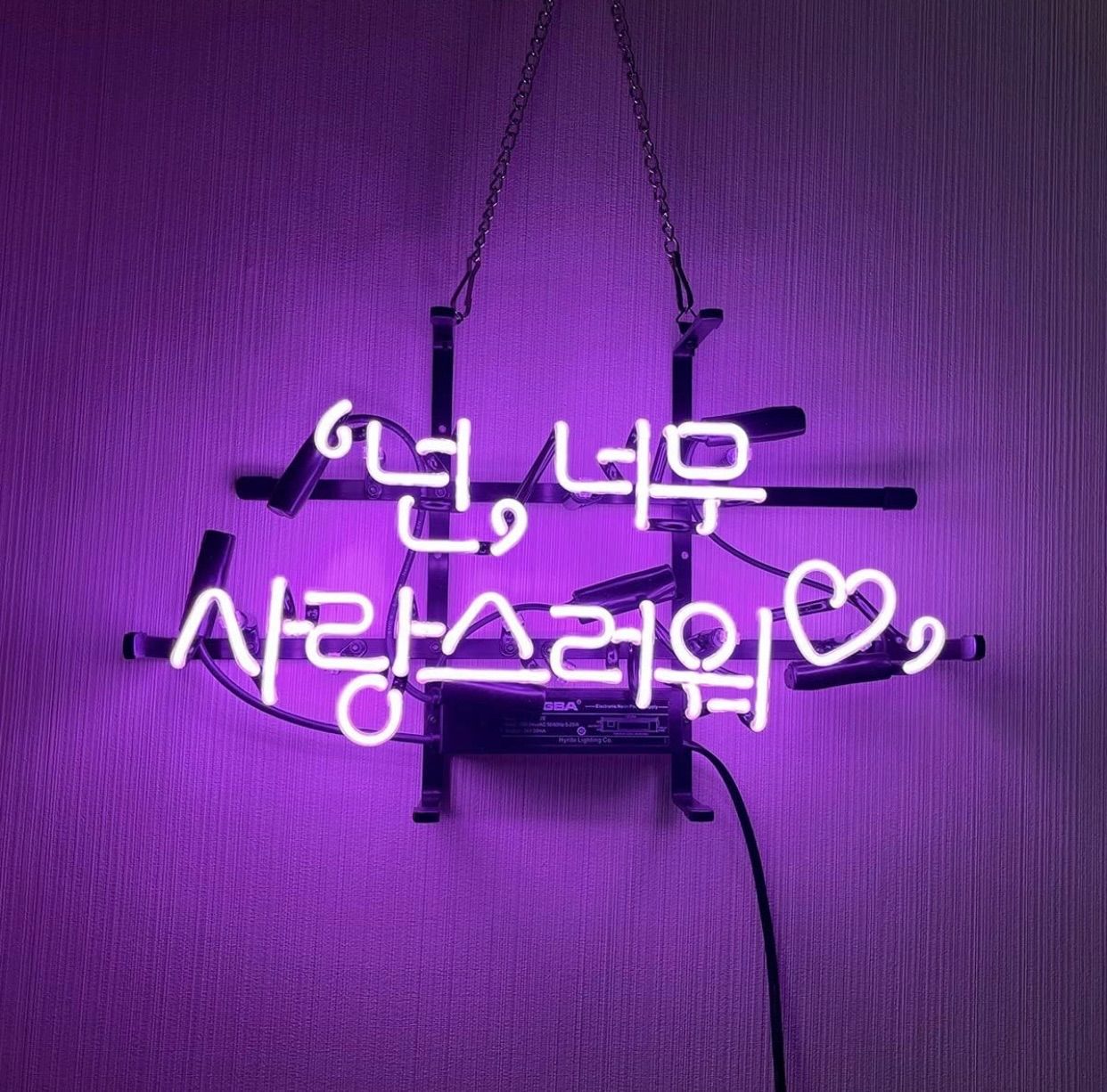 こちらのネオン看板は、韓国語で「넌, 너무 사랑스러워(ノン、ノム サランスロウォ)」と書かれており、日本語に訳すと「君は本当に愛らしい」「あなた、とっても可愛いよ」という意味になります。温かく優しいメッセージとハートのモチーフが組み合わさって、癒しと愛情に包まれる空間を演出します。