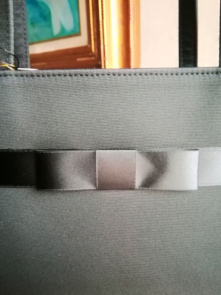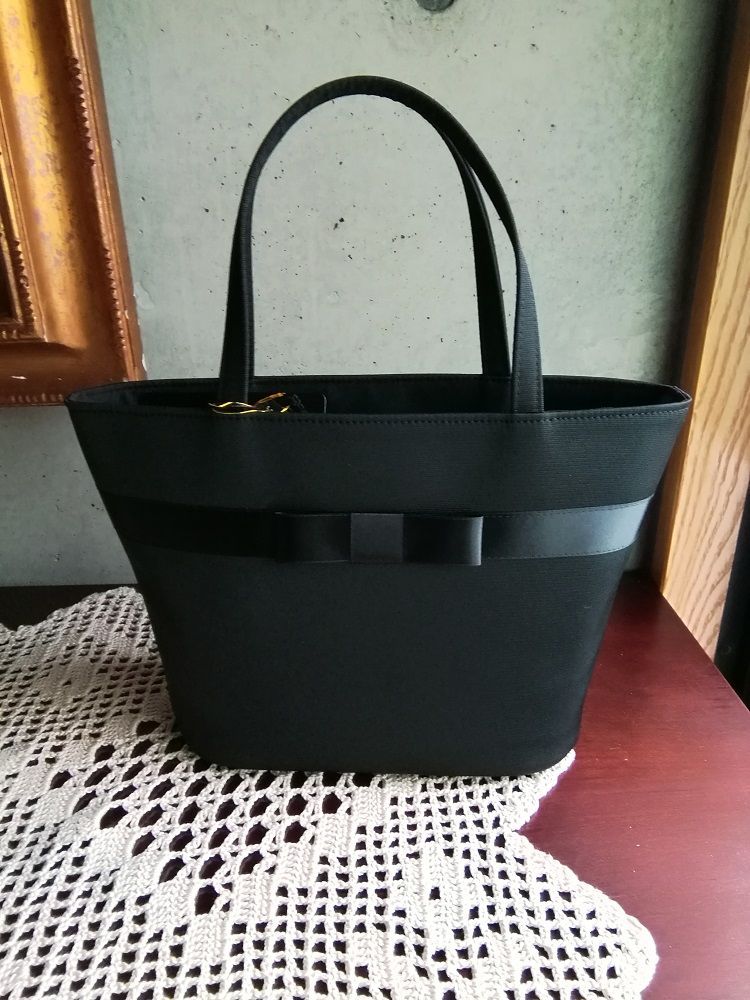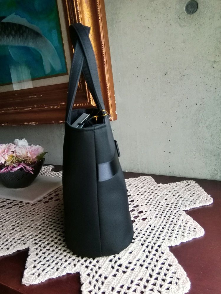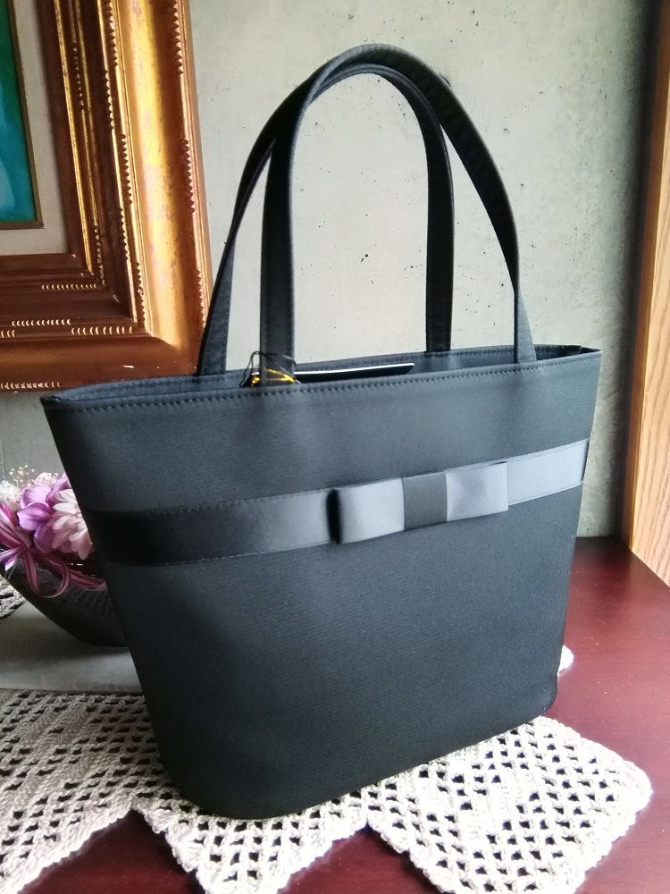 ブラックフォーマル用の漆黒染めの厚地生地を使用し、サテンのリボンデザインが上品で可愛らしく仕上がりました。合皮等の劣化の心配もございません。