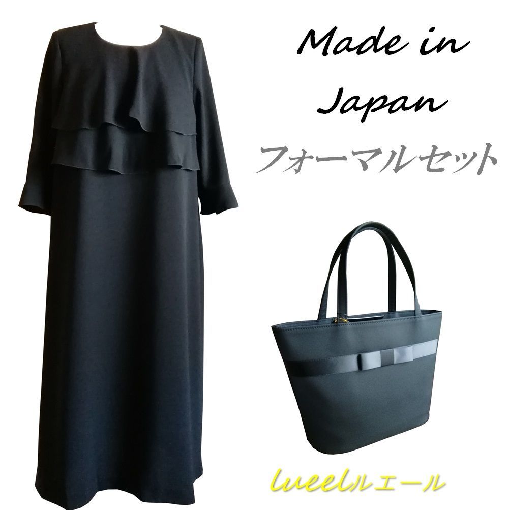 喪服ワンピースで一番人気のオールシーズン着ていただけるワンピースとバッグのセット。