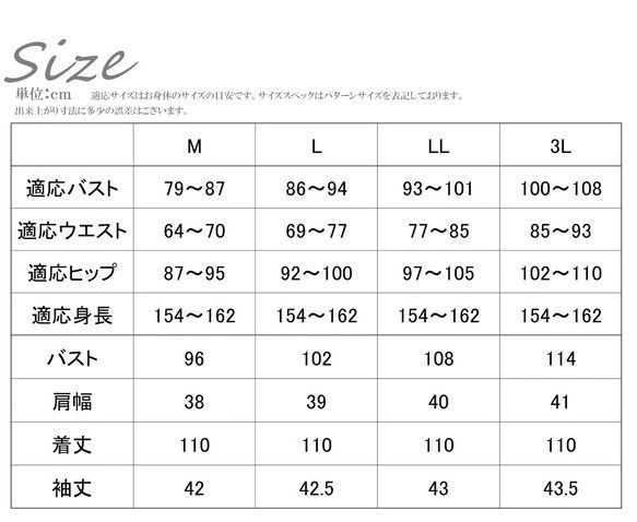 3Lサイズ:バスト114cm/肩幅41cm/着丈110cm/袖丈43.5