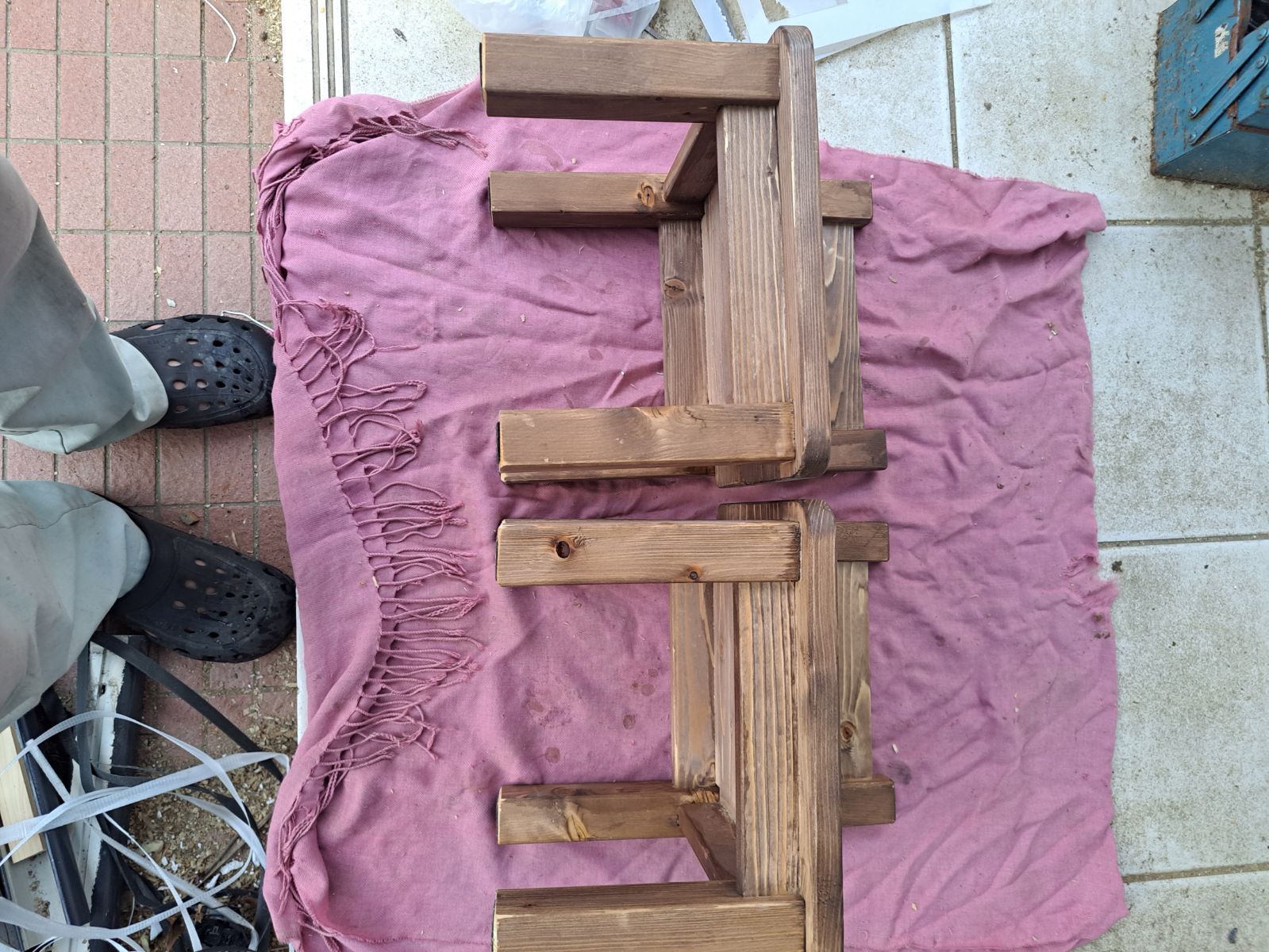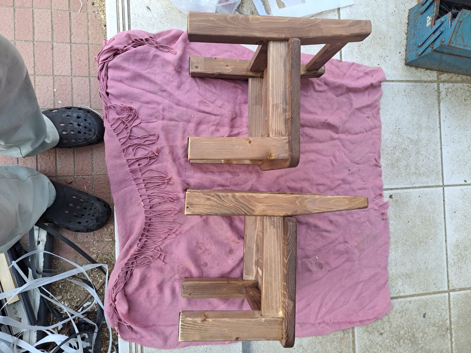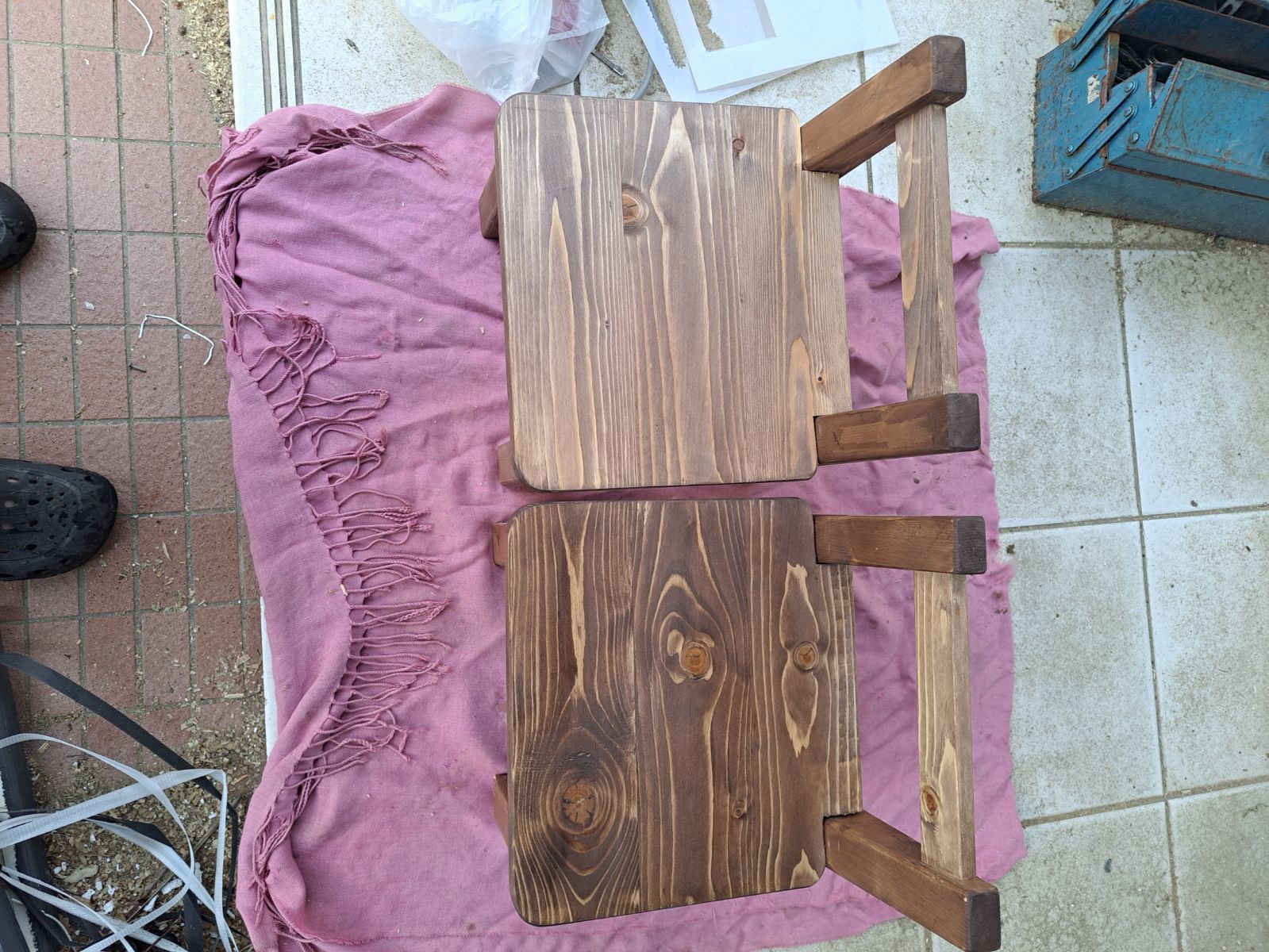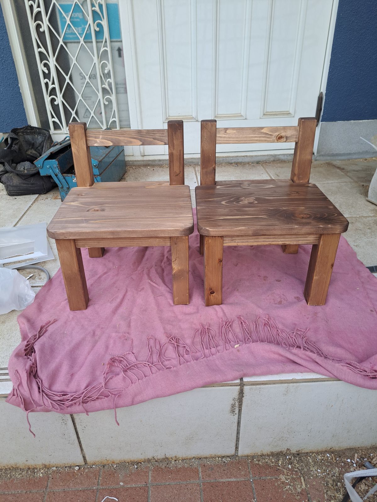 趣味で木工しています。 こちらは2台セット販売です。 木材は足も座面も全てSPFホワイトウッドを使用しています。 自然素材なので節やシミ又趣味の手作りなので多少の傷・パテ埋め・汚れ・隙間・磨き不足・塗装へたくそはあります。 座面は285mm×265mmで高さ200mmです。 背もたれを含めた全体の高さは335mmで奥行き275mmで横幅285mmです。(およそです) 仕上げはウォルナット色に着色後ウレタン塗装仕上げです 。 素人の作品ですが、ビスや釘等金具は一切使わず本格ほぞ組構造で作って居ますのでガッチリしていますので子供さんに安心して座ってもらえるかと思います。 素人の手作り品ですので、家具屋さんで見るような高級家具と比較されては困ります。 子供椅子のほかに鉢植え・ぬいぐるみ・小物雑貨などオシャレに飾ってお楽しみください。