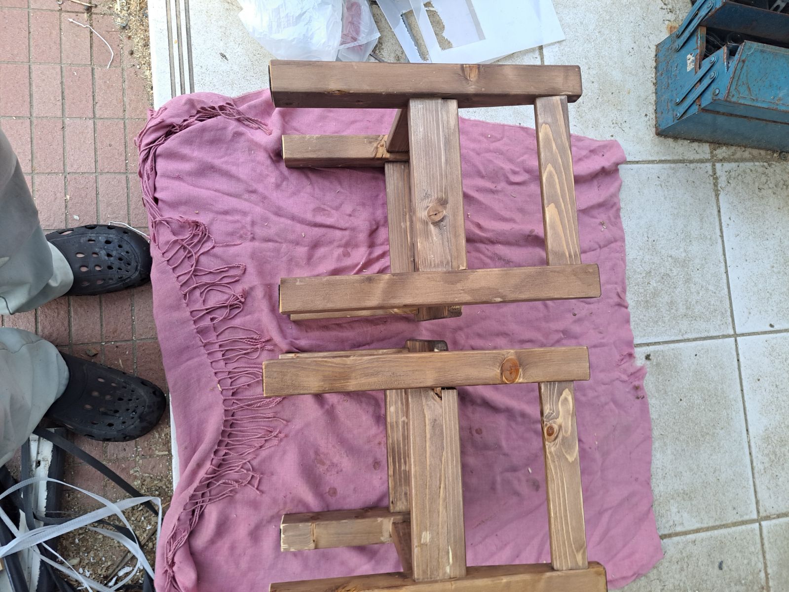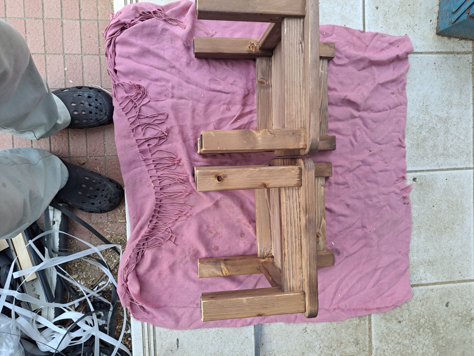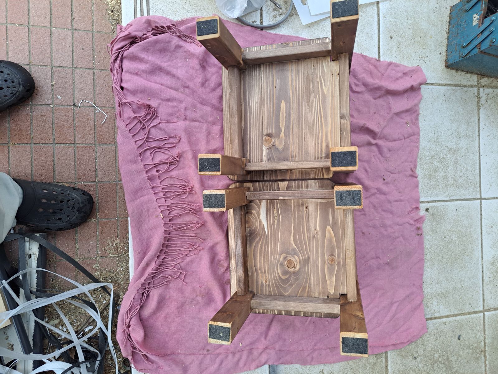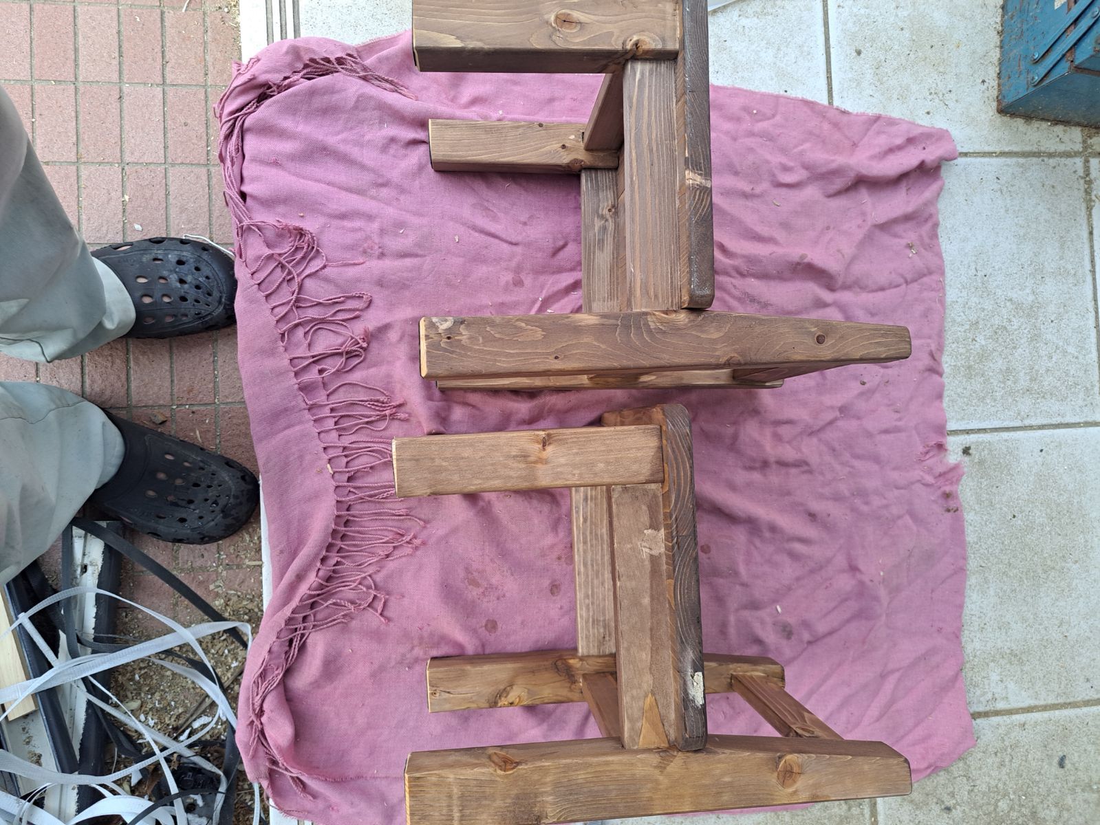 趣味で木工しています。 こちらは2台セット販売です。 木材は足も座面も全てSPFホワイトウッドを使用しています。 自然素材なので節やシミ又趣味の手作りなので多少の傷・パテ埋め・汚れ・隙間・磨き不足・塗装へたくそはあります。 座面は285mm×265mmで高さ200mmです。 背もたれを含めた全体の高さは335mmで奥行き275mmで横幅285mmです。(およそです) 仕上げはウォルナット色に着色後ウレタン塗装仕上げです 。 素人の作品ですが、ビスや釘等金具は一切使わず本格ほぞ組構造で作って居ますのでガッチリしていますので子供さんに安心して座ってもらえるかと思います。 素人の手作り品ですので、家具屋さんで見るような高級家具と比較されては困ります。 子供椅子のほかに鉢植え・ぬいぐるみ・小物雑貨などオシャレに飾ってお楽しみください。
