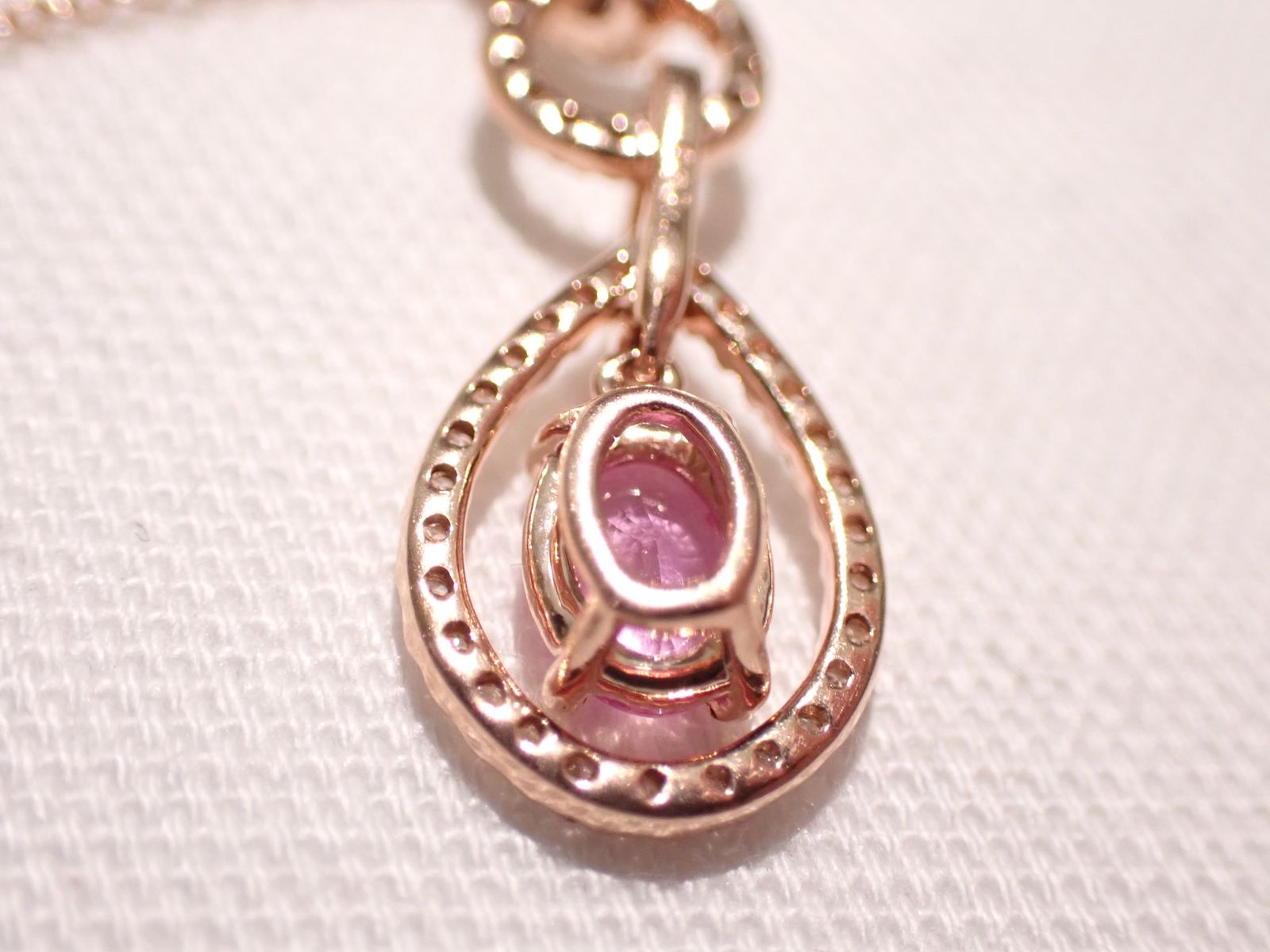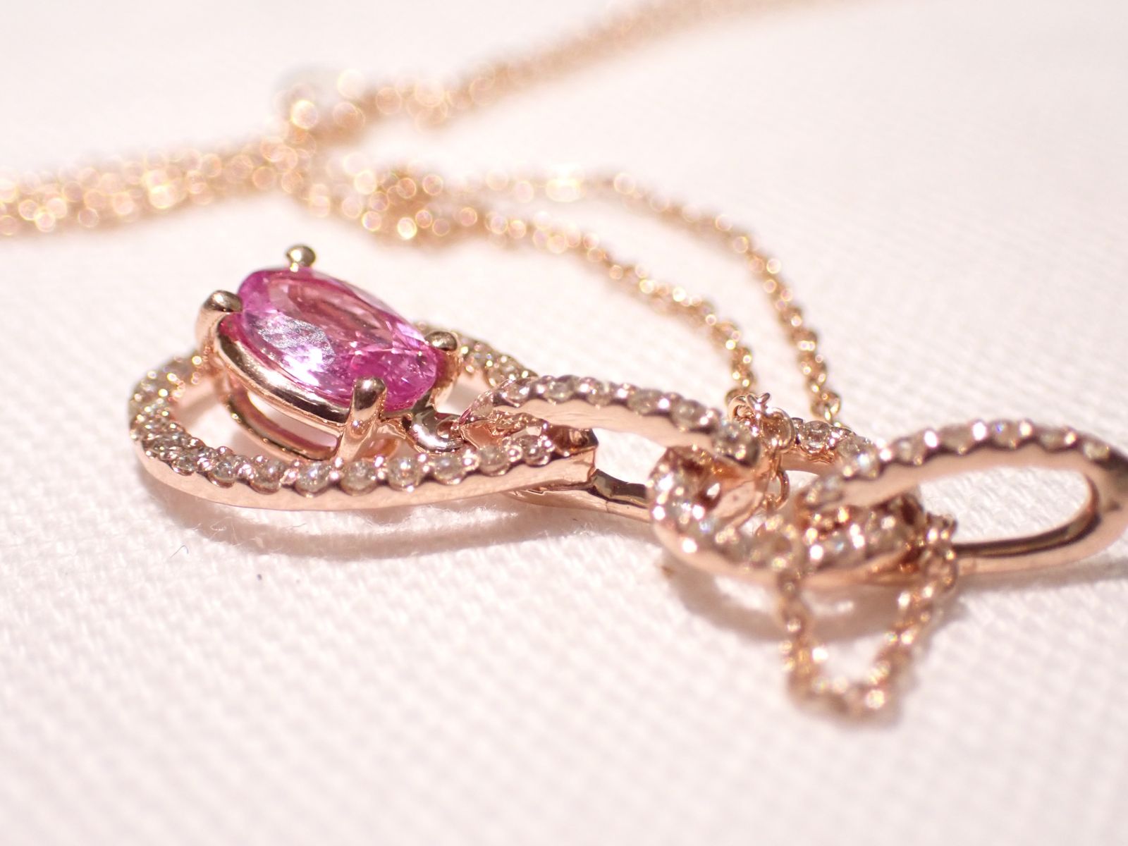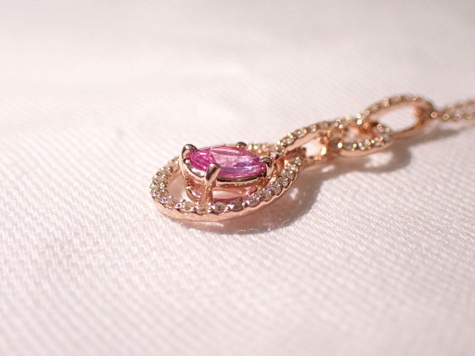 小さめのダイヤモンドがあしらわれた中央に、ピンクサファイヤの石が胸元を華やかに演出してくれる一品でございます。