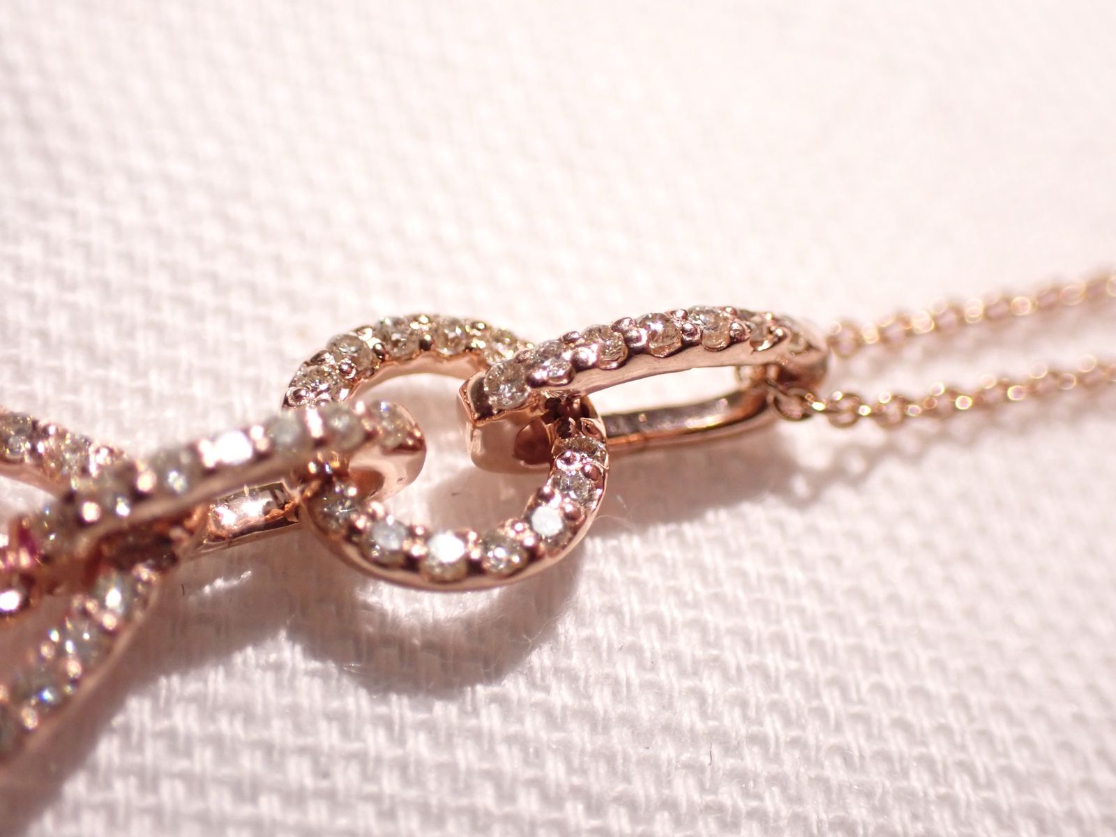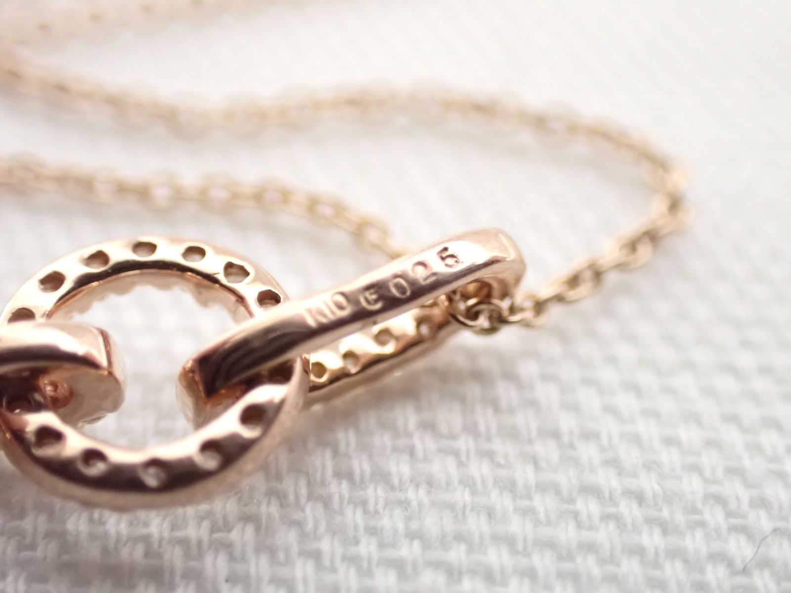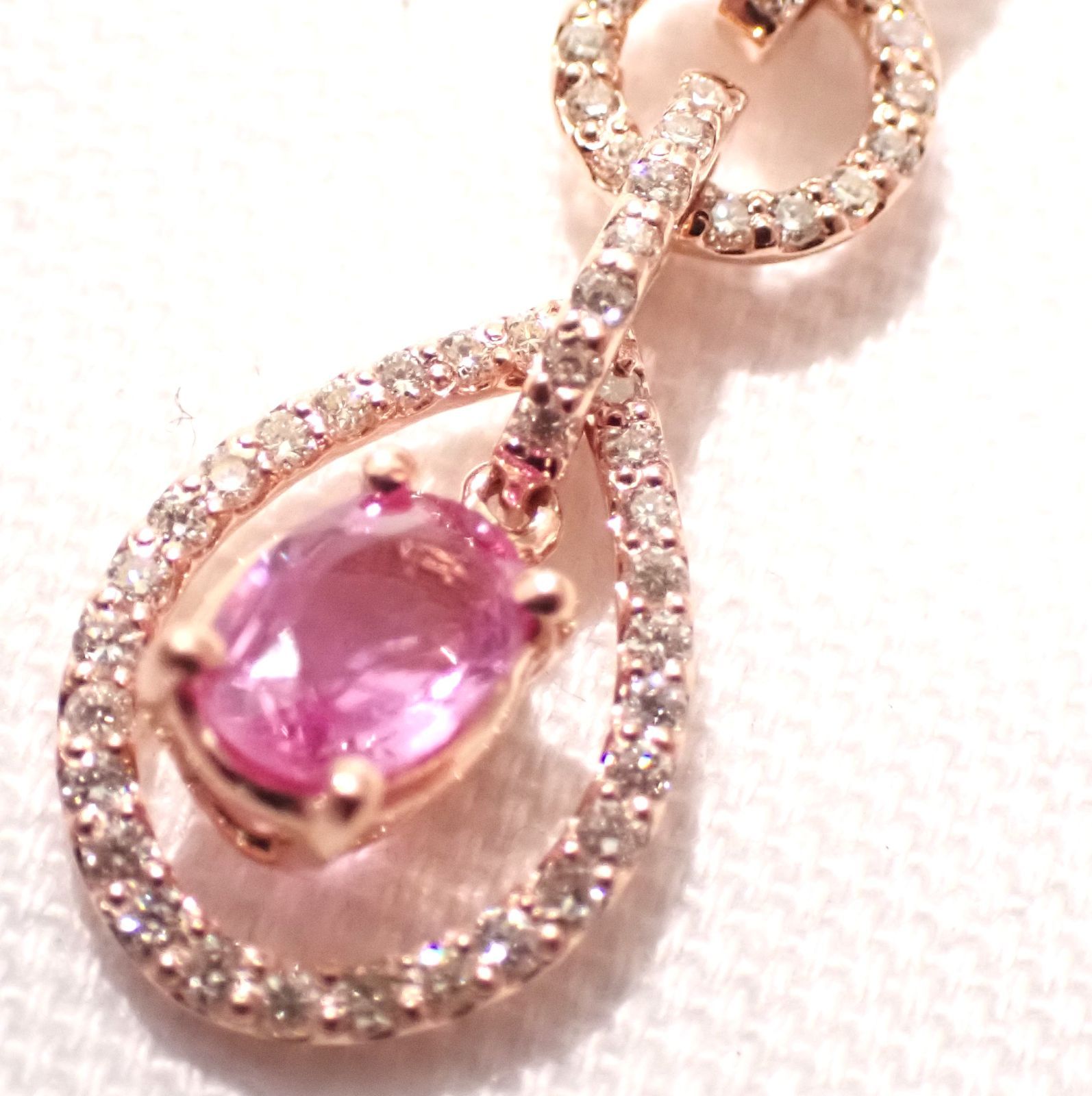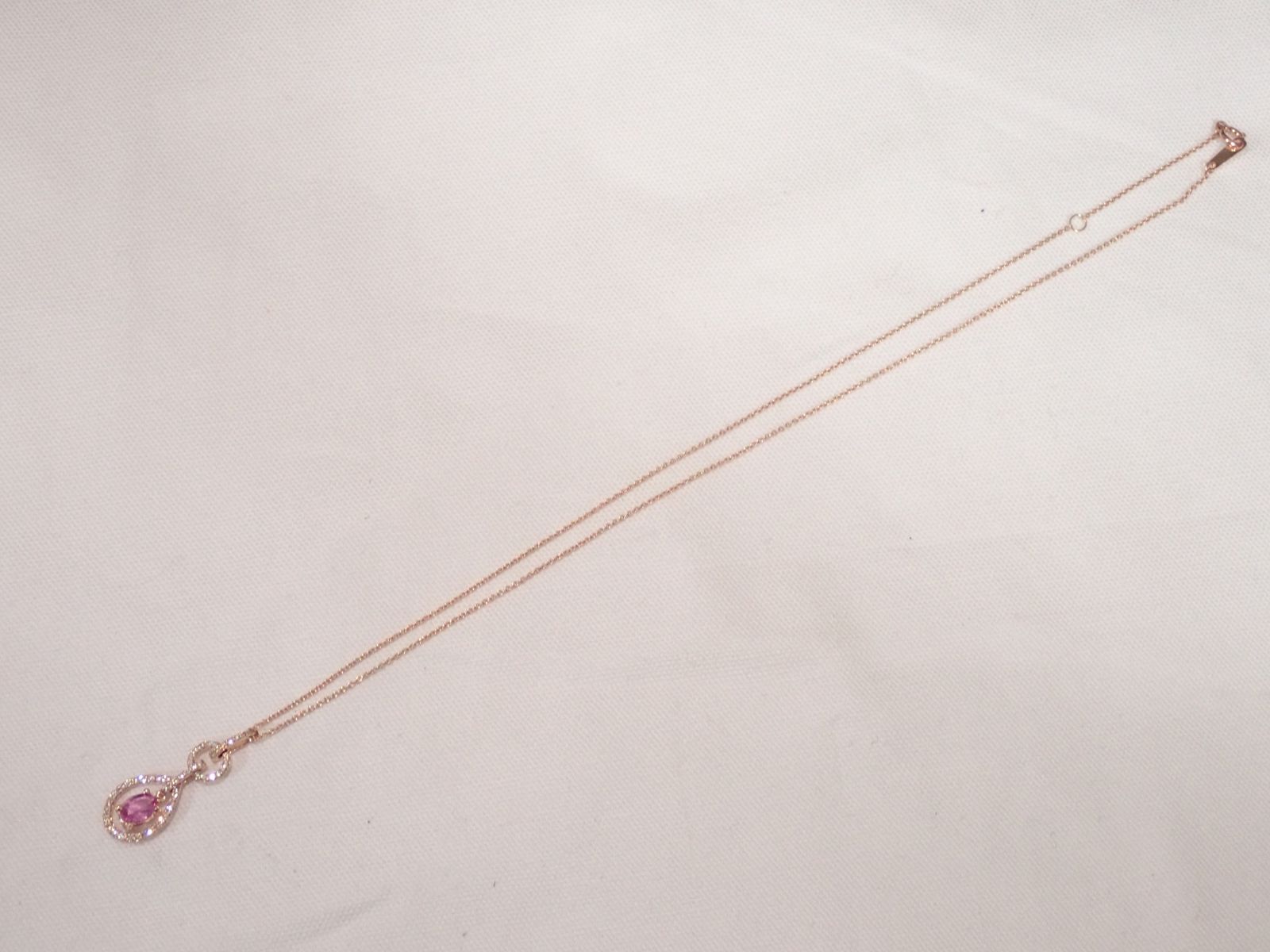 小さめのダイヤモンドがあしらわれた中央に、ピンクサファイヤの石が胸元を華やかに演出してくれる一品でございます。