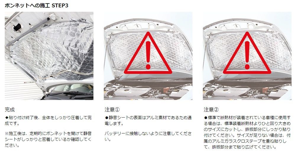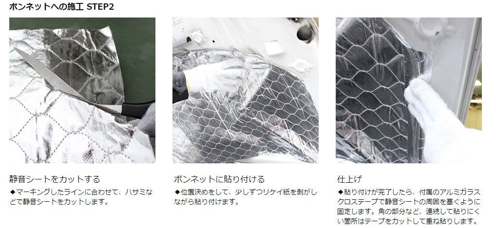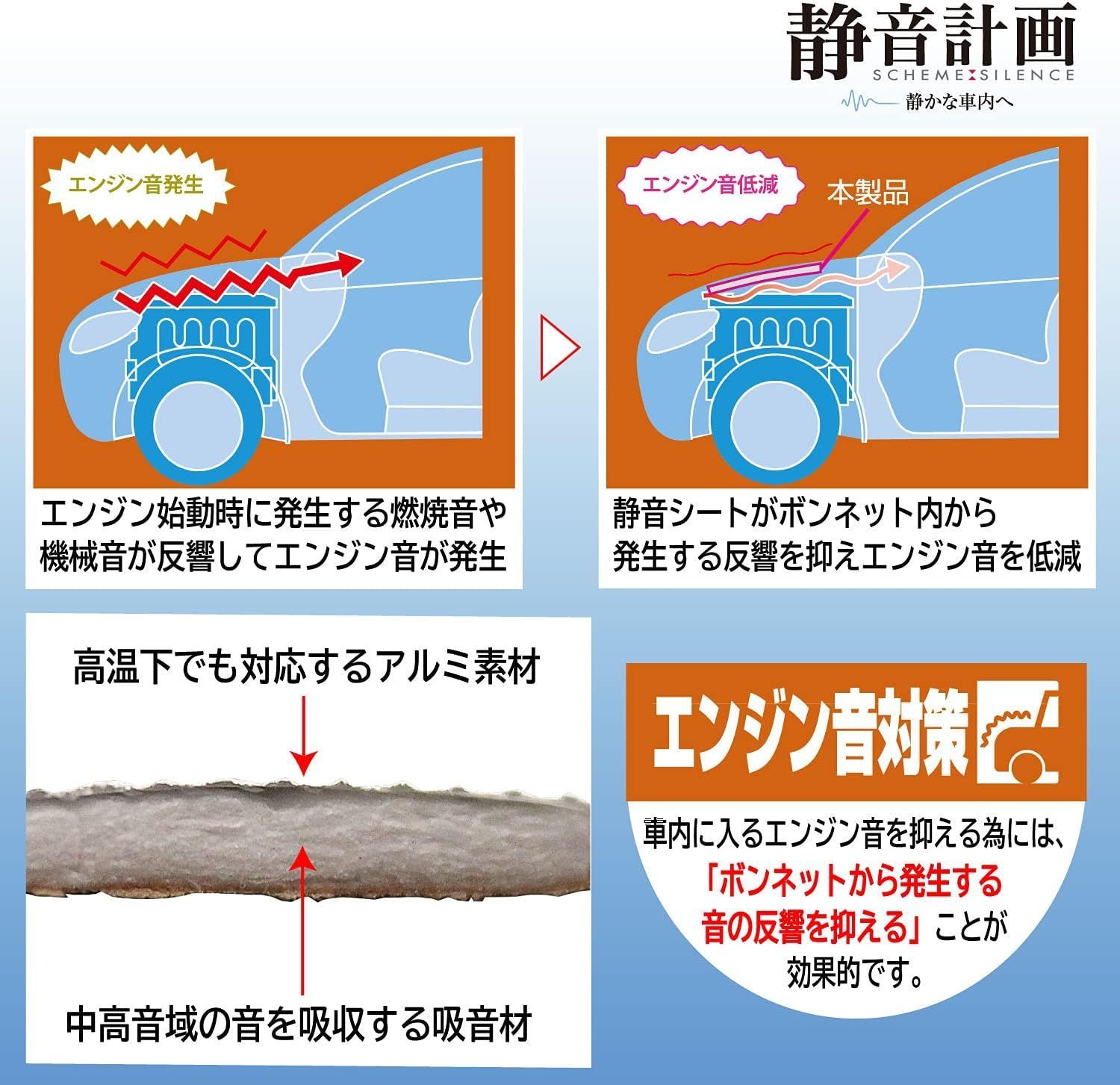 エンジンルーム静音シートは、高温下でも対応するアルミ素材と中高音域の音を吸収する吸音材で構成されており、車内に入り込むエンジン音を低減できます。