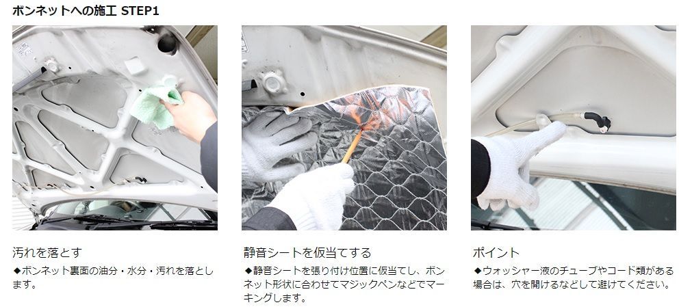 車のエンジン始動時に発生するエンジン本体から放射される燃焼音や機械音が反響するノイズをエンジン音といいます。エンジン音を抑制させるためには、ボンネット内から発生する反響を抑えることでエンジン音の侵入を防ぎ、効果的にノイズを抑制できます。