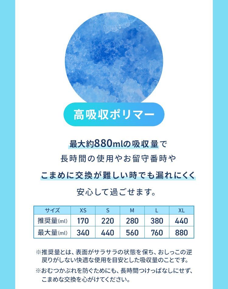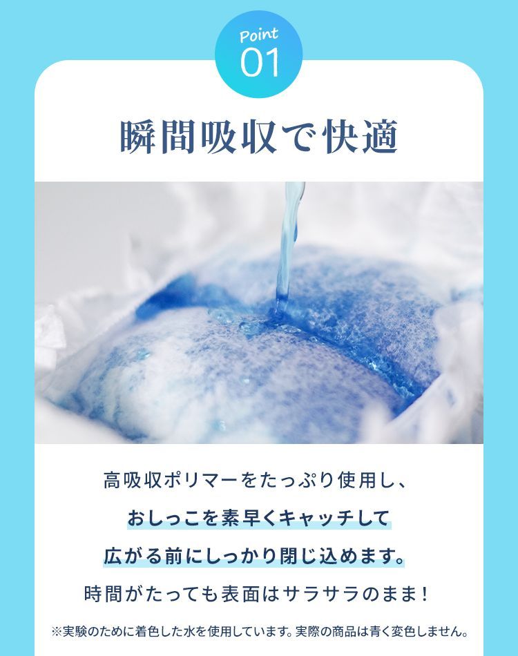 たっぷりの瞬間吸収ポリマーで逆戻りを防ぎます。