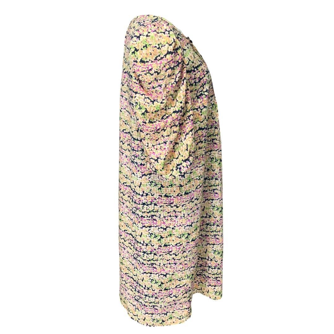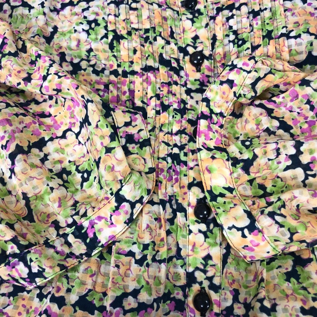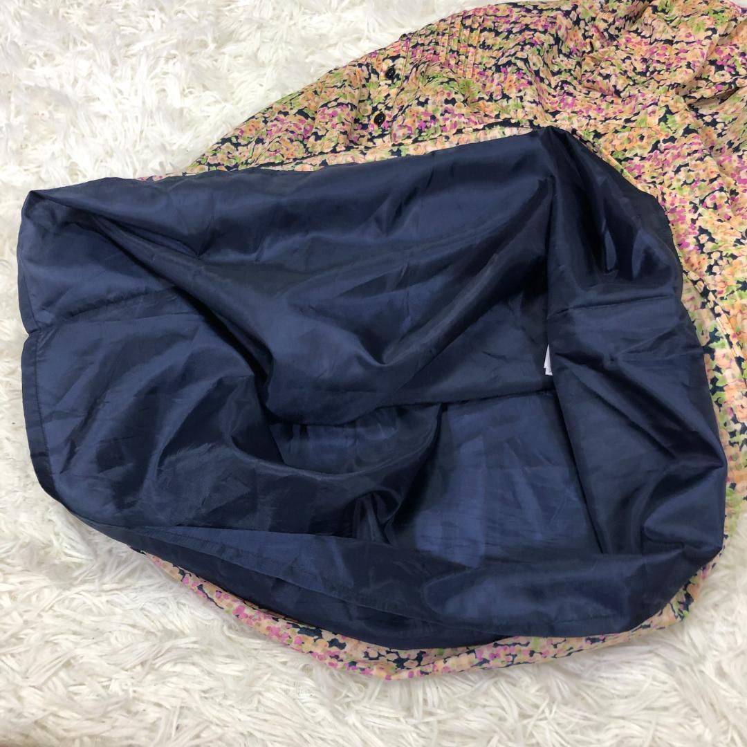 水彩画で描いたような柔らかい雰囲気の花柄にタックが入っています。袖はフリルスリーブで、二の腕をカバーしつつフェミニンな印象を与えます。スカート部分は動きに合わせてふわっと揺れるシルエットです。サイドにベルトループがあります。