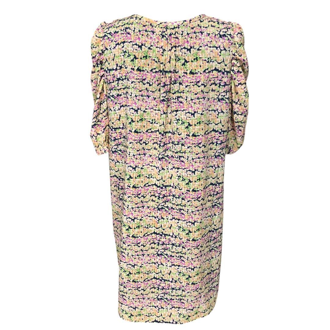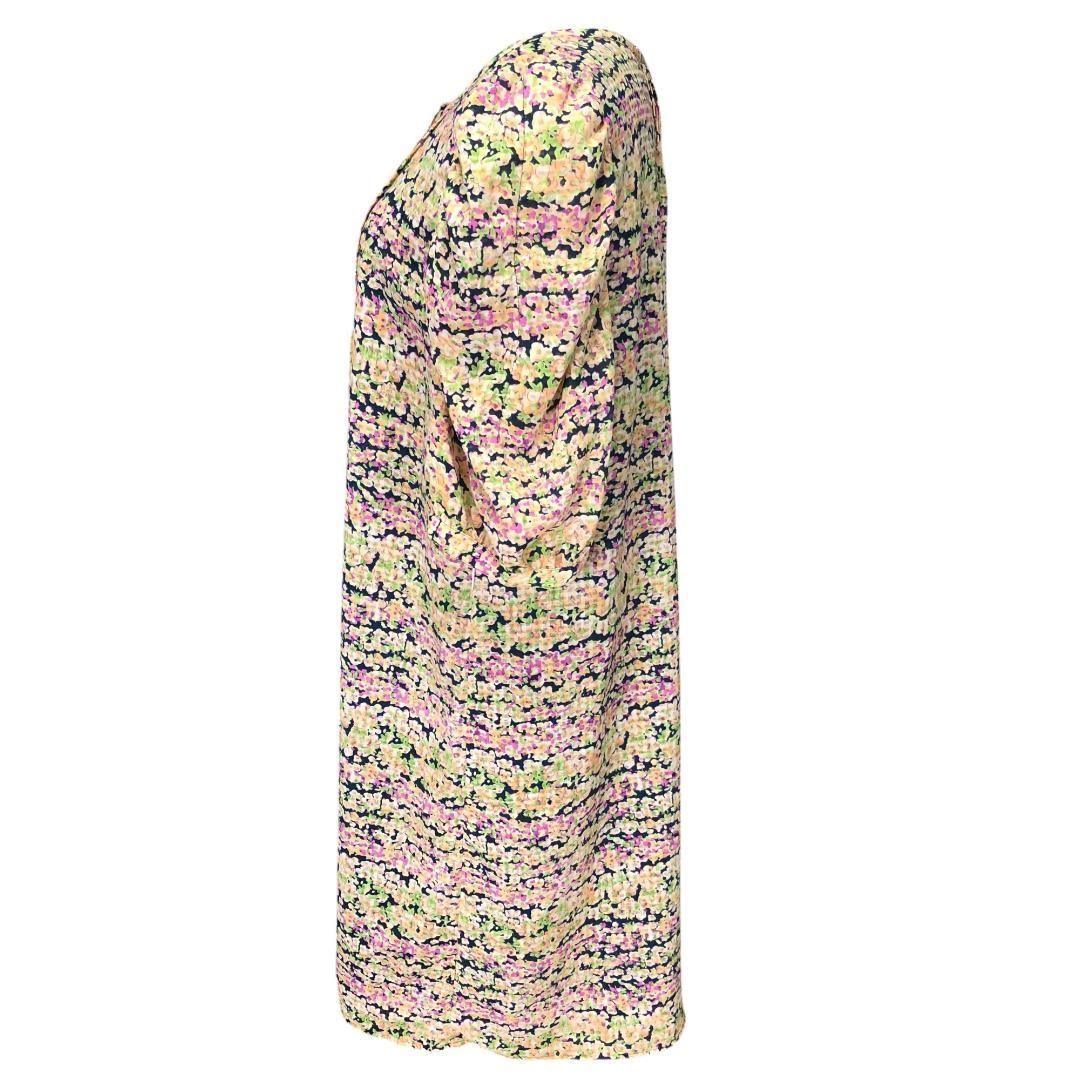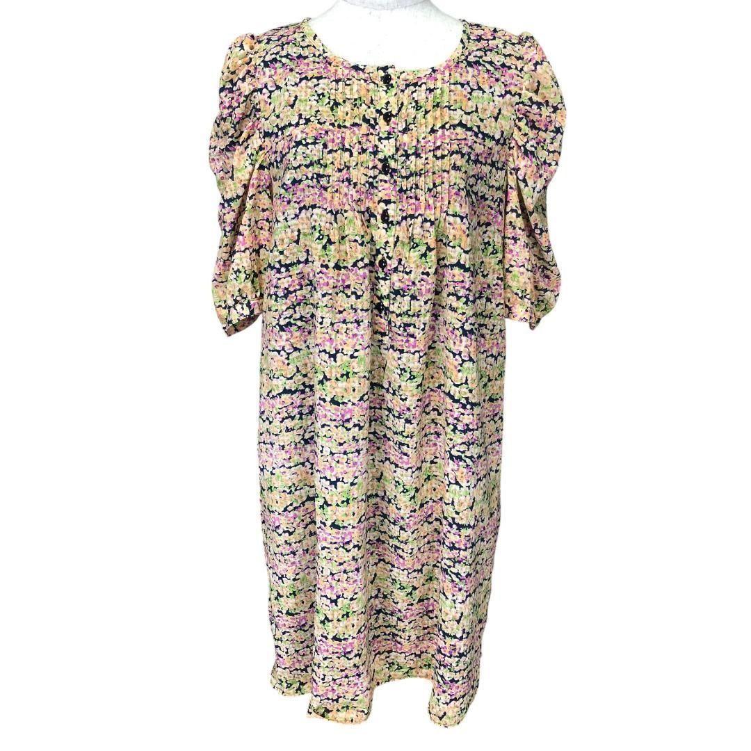 水彩画で描いたような柔らかい雰囲気の花柄にタックが入っています。袖はフリルスリーブで、二の腕をカバーしつつフェミニンな印象を与えます。スカート部分は動きに合わせてふわっと揺れるシルエットです。サイドにベルトループがあります。
