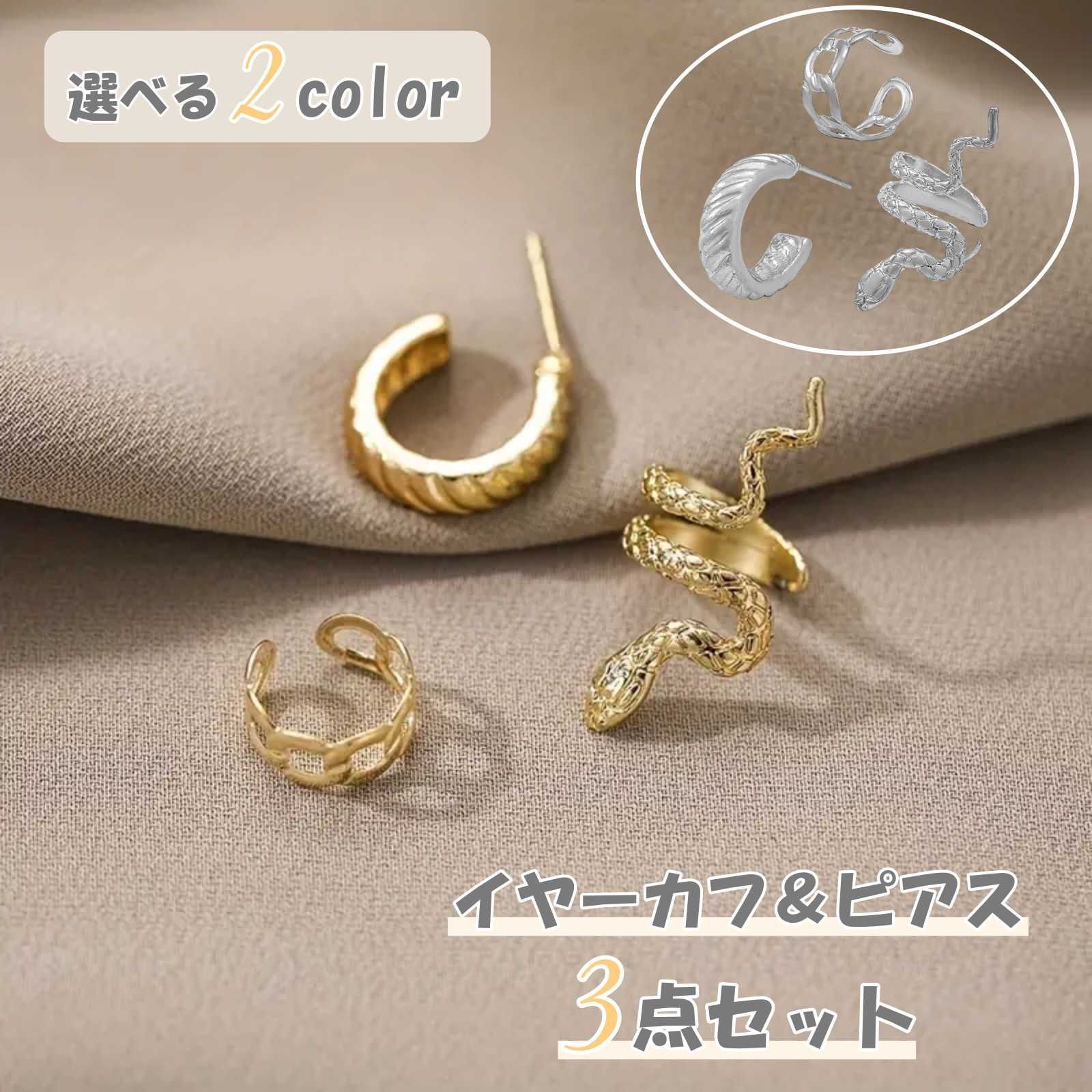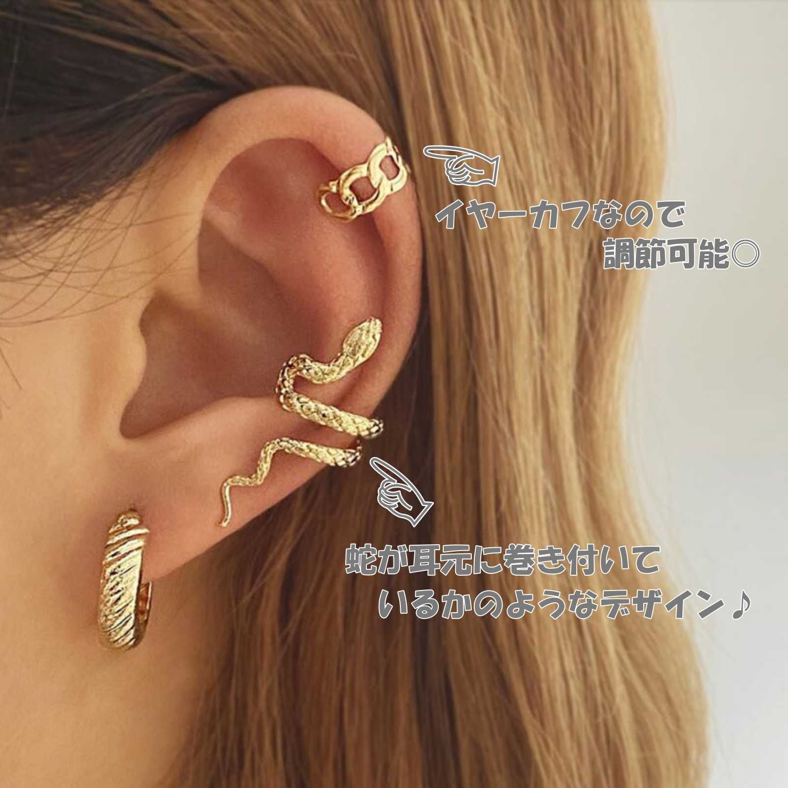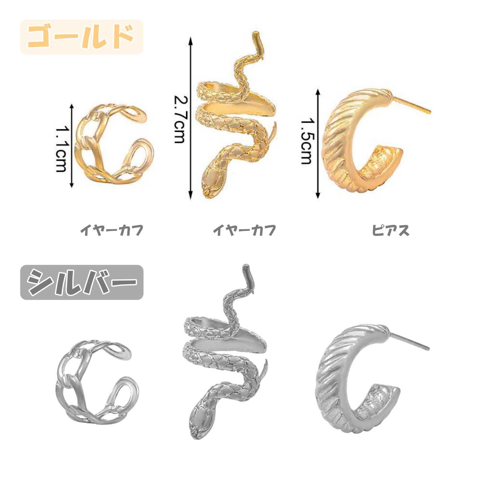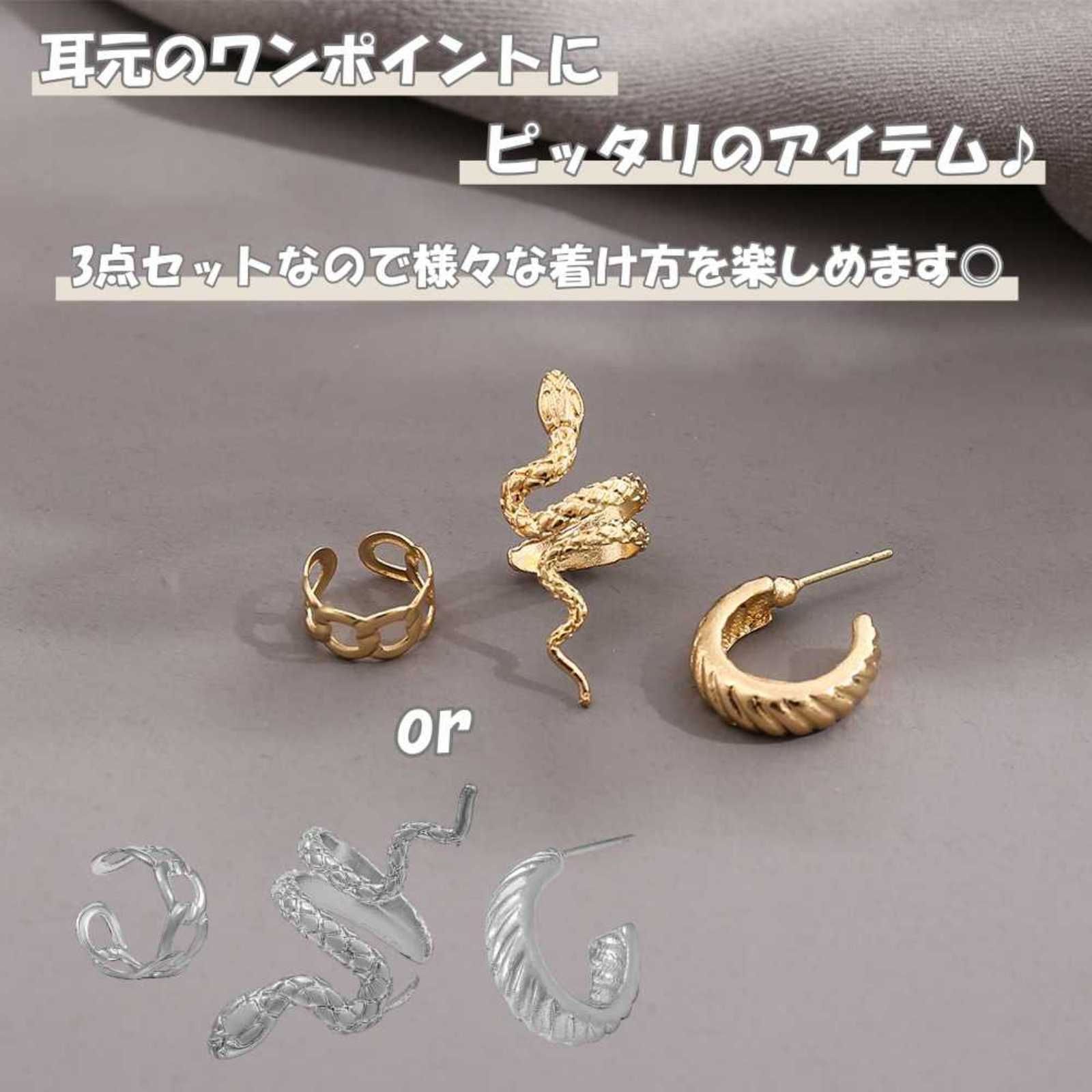 蛇をモチーフにしたイヤーカフが特徴的なイヤーカフ&ピアスの合計3点セットです。