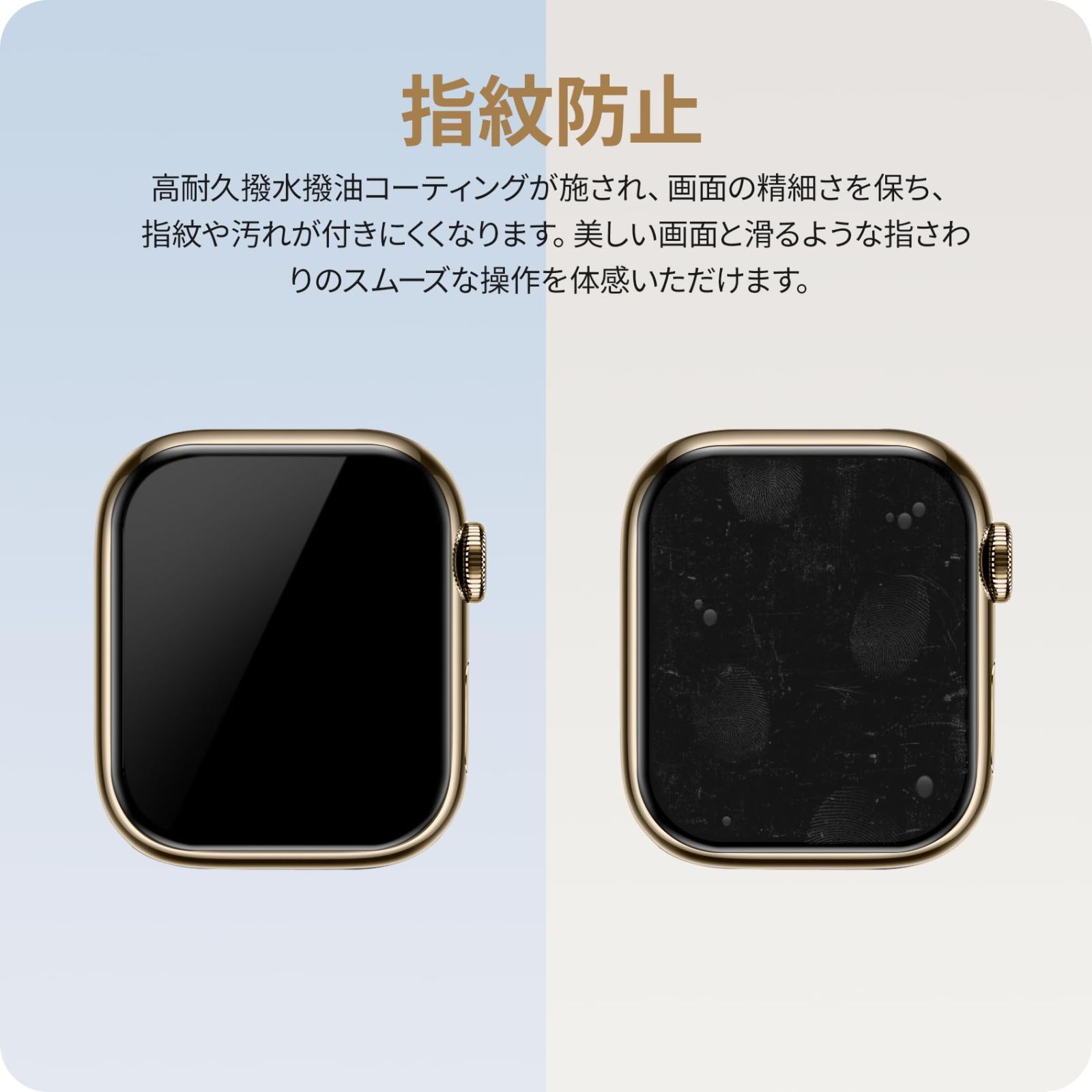【高透過率&高感度タッチ】高透過率を持つ極薄PET素材のため透明度が高く、Watch画面の精細さを損ないません。また、高品質な素材を採用しているのでフィルムを装着している違和感はなく、タッチ感度も抜群です。3Dラウンドエッジ加工が施されており、サイドからの衝撃に耐える頑丈さを持ちながら、触ったときの引っ掛かり感はなく、快適で滑らかな質感を実現しました。