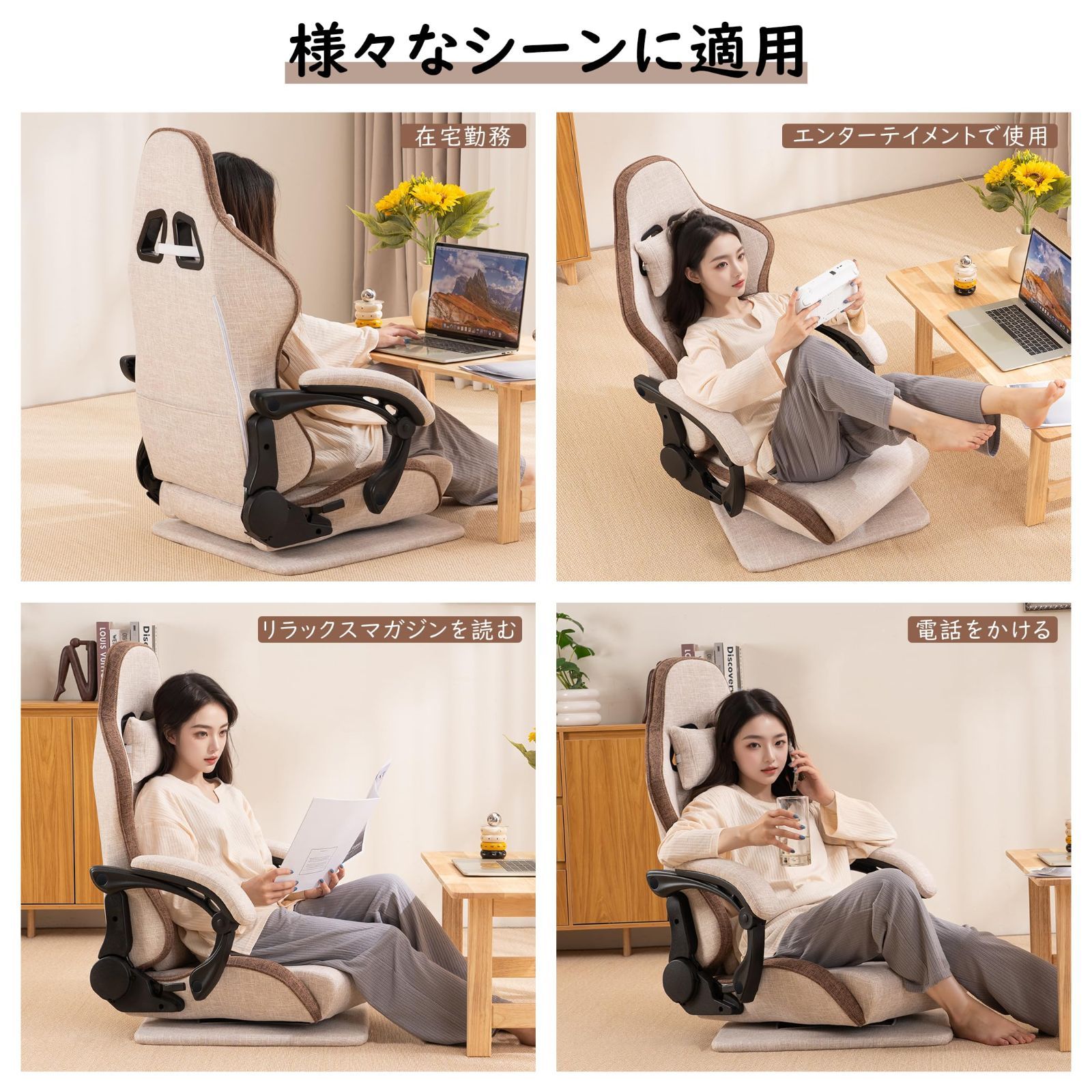 「おしゃれデザイン」おしゃれなファブリック素材のゲーミング座椅子で、エレガントな雰囲気と快適性を両立。