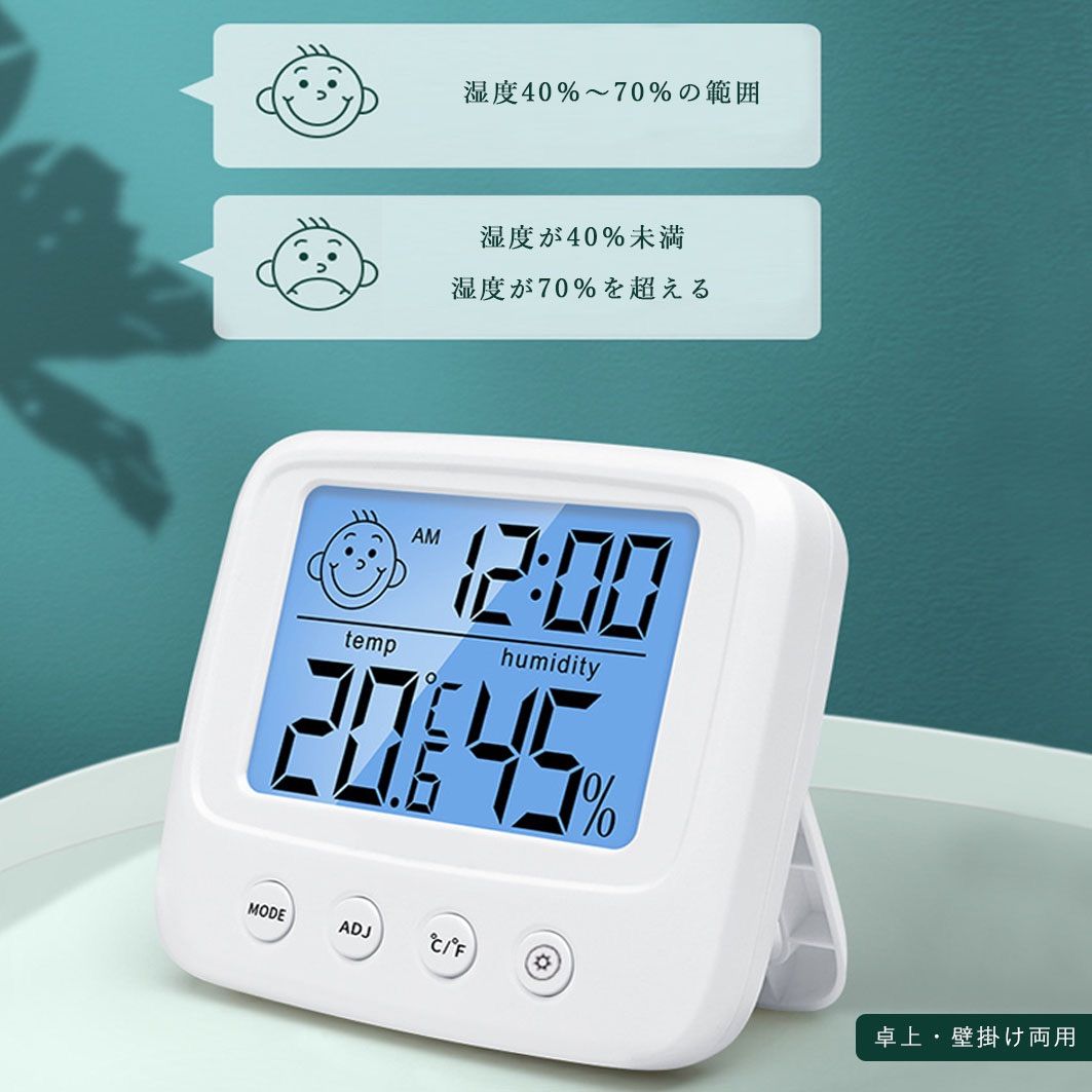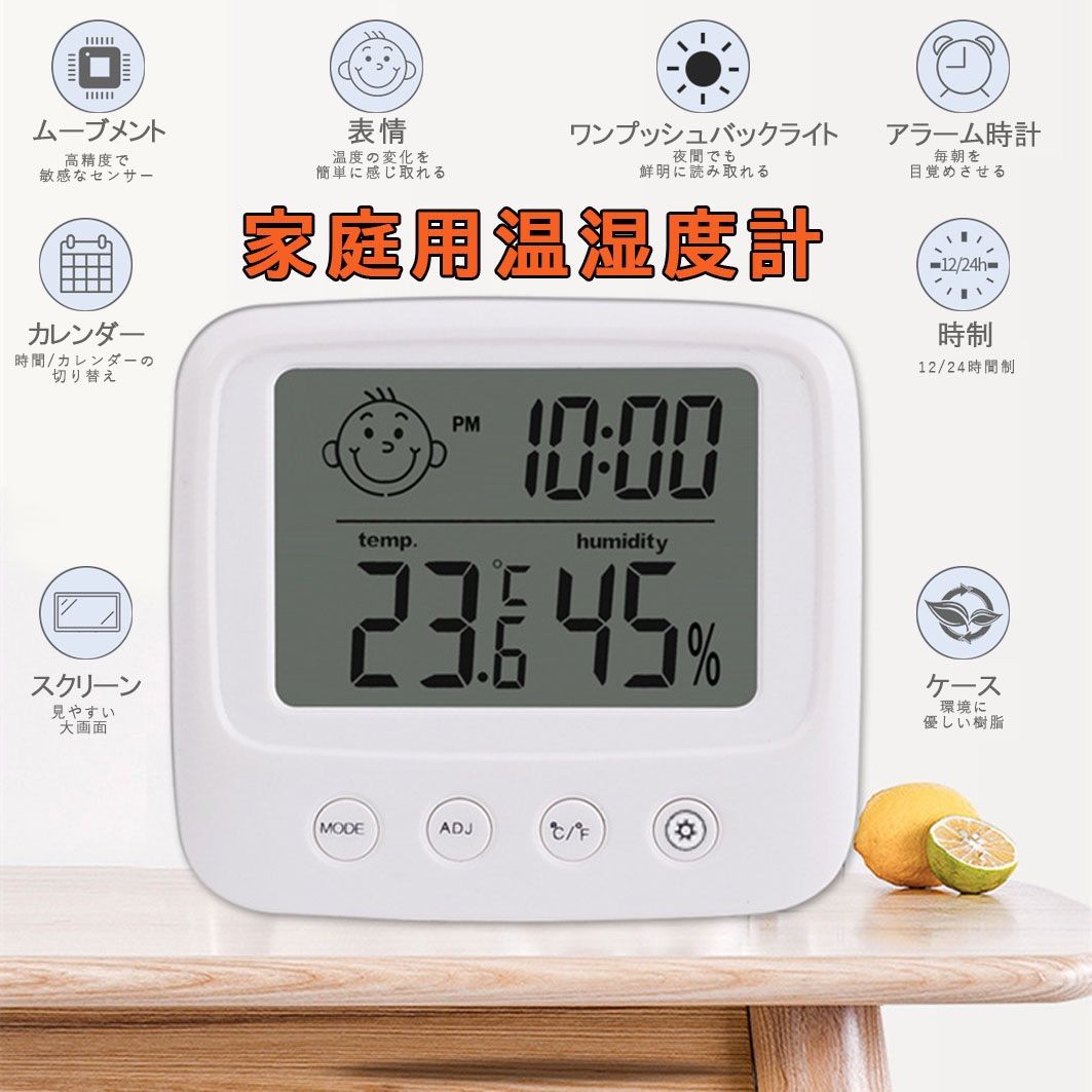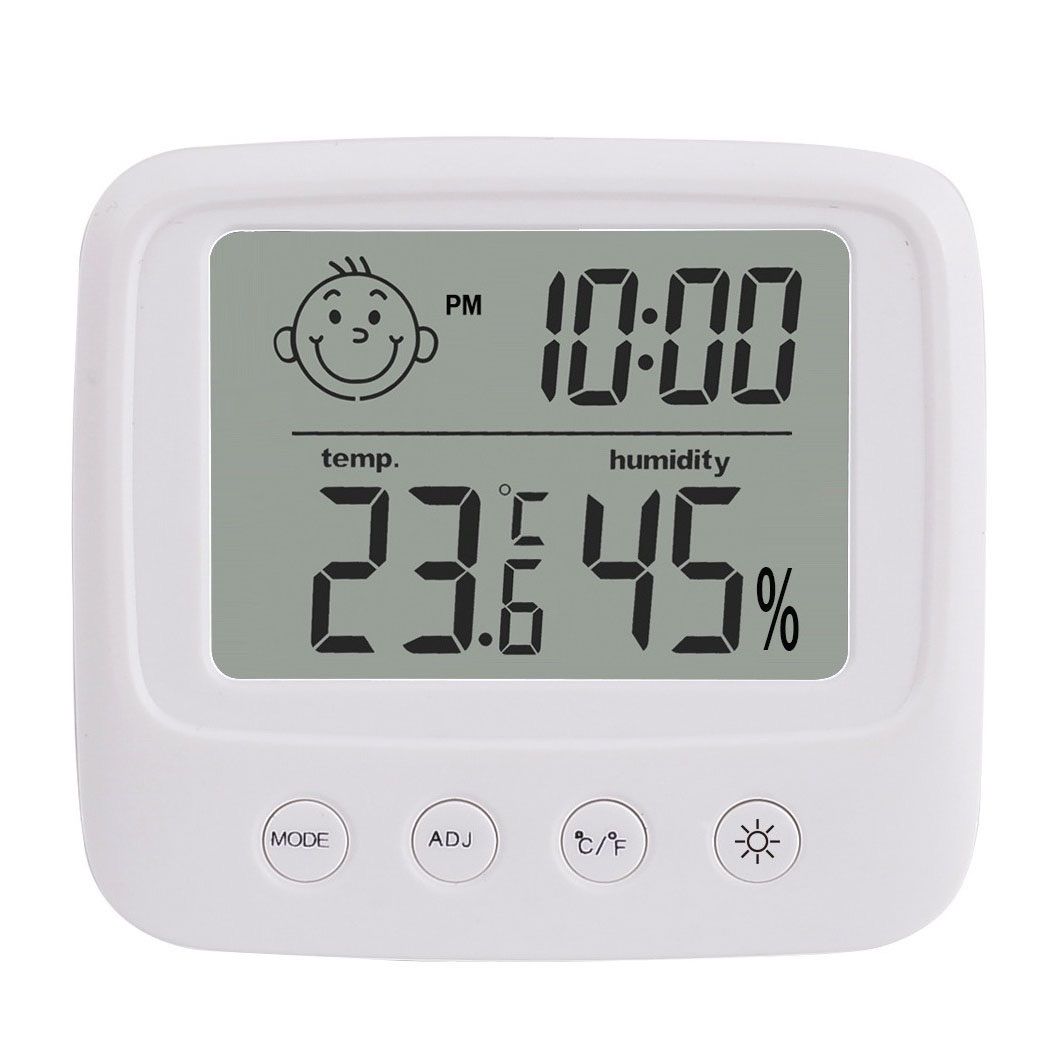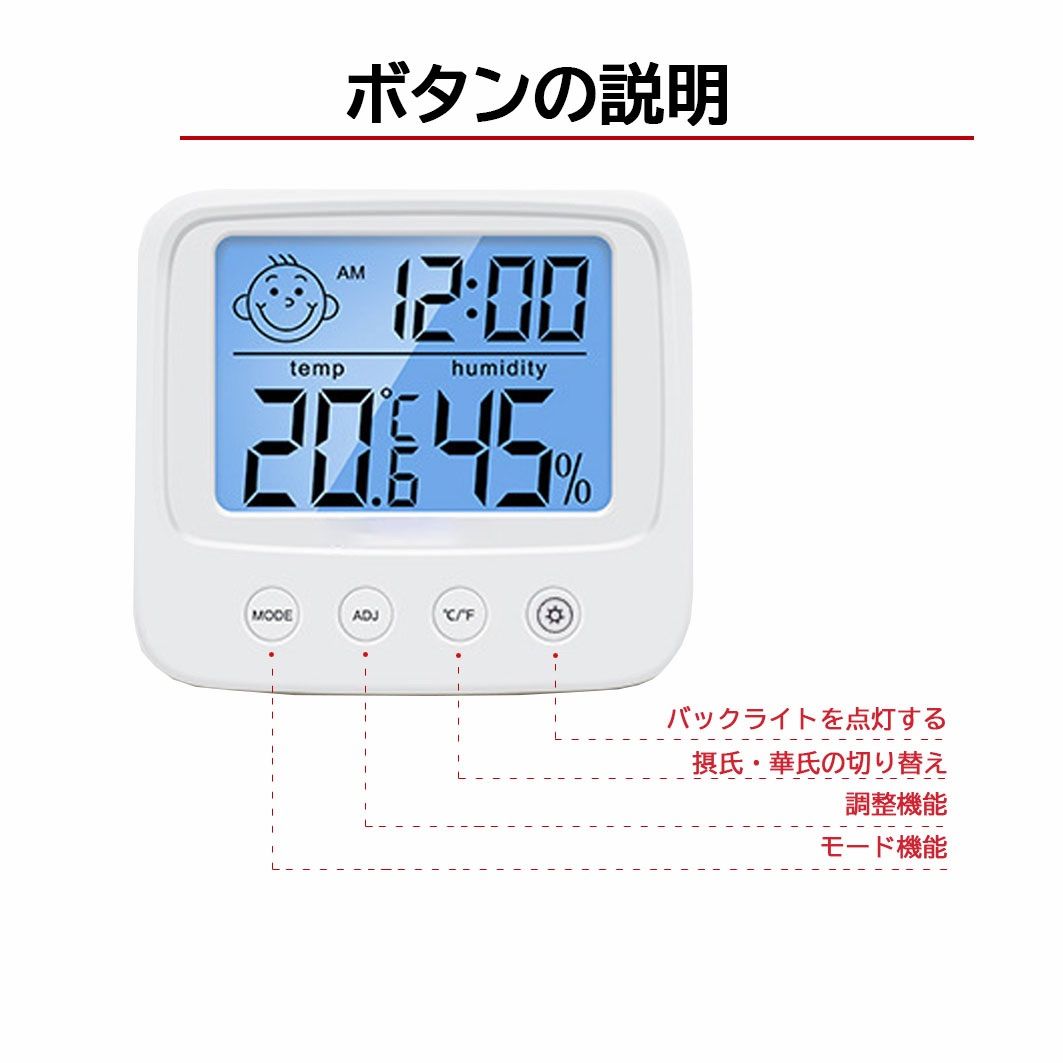 【多機能デジタル温湿度計】現在温度、湿度と感知表情があり、現時点の温度や表情によって、加湿器とサーモスタットを設定するかどうかの判定がしやすくなります。