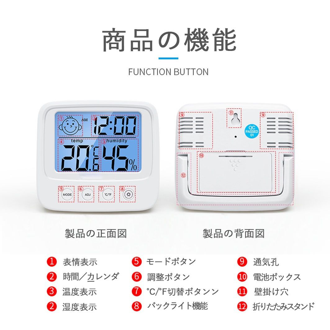 【バックライト付き】バックライトボタンを押せば、バックライトが点灯します。周囲が暗くても温度、湿度、時間などの確認がすごく便利です。