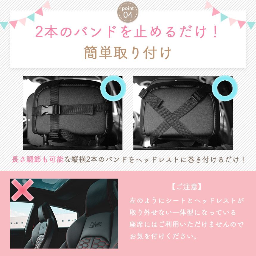 縦横の2本のバンドをヘッドレストに巻き付けて止めるだけの簡単装着!