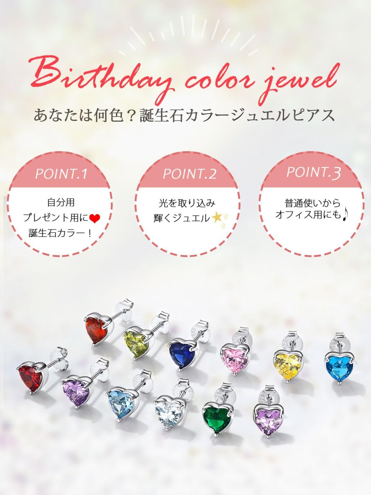 [12誕生石が選べる] (1月)ガーネット、(2月)アメシスト、(3月)アクアマリン、(4月)ダイヤモンド、(5月)エメラルド、(6月)アレキサンドライト、(7月)ルビー、(8月)ペリドット、(9月)サファイア、(10月)ピンクトルマリン、(11月)トパーズ、(12月)タンザナイトの12種類の誕生石からお選びいただけます。