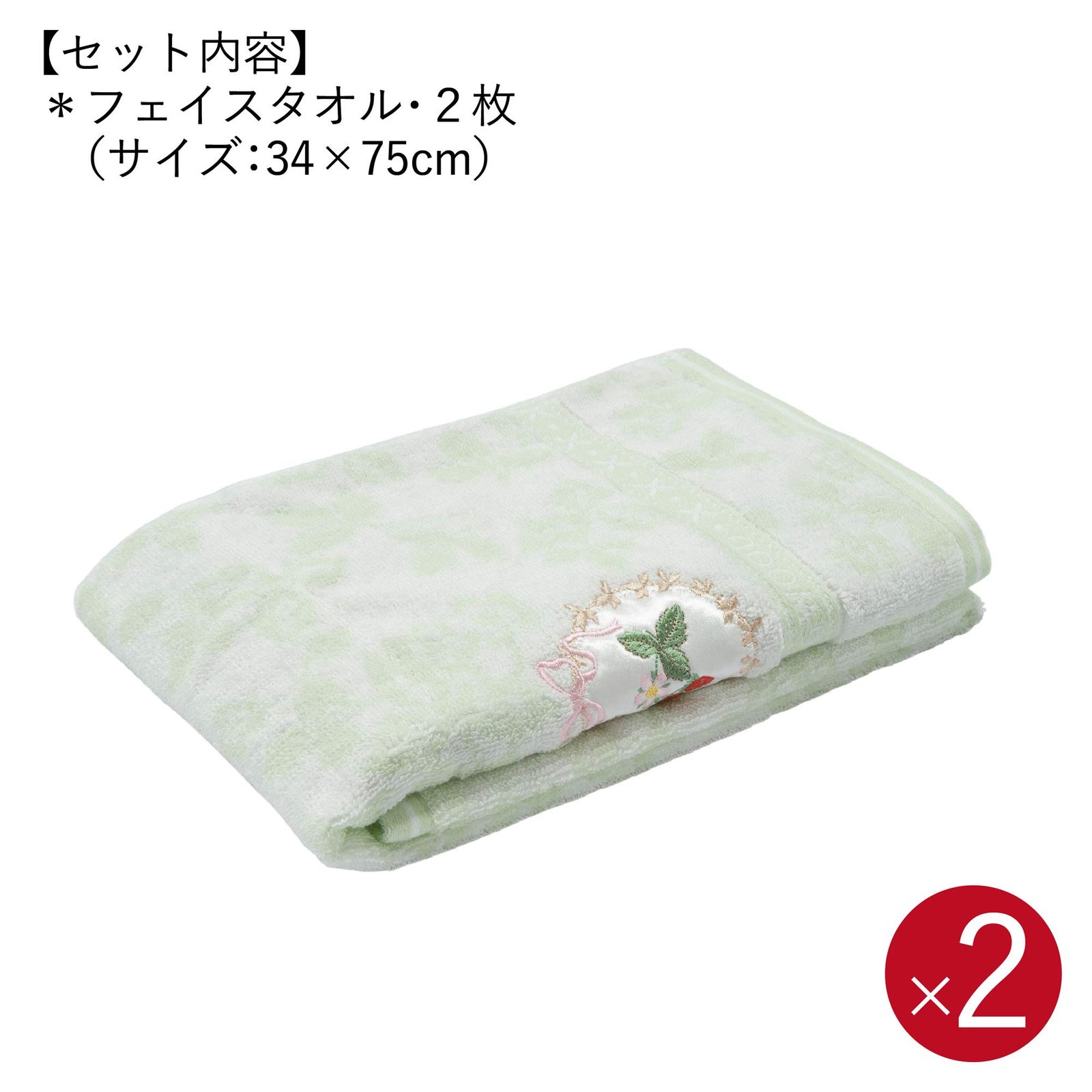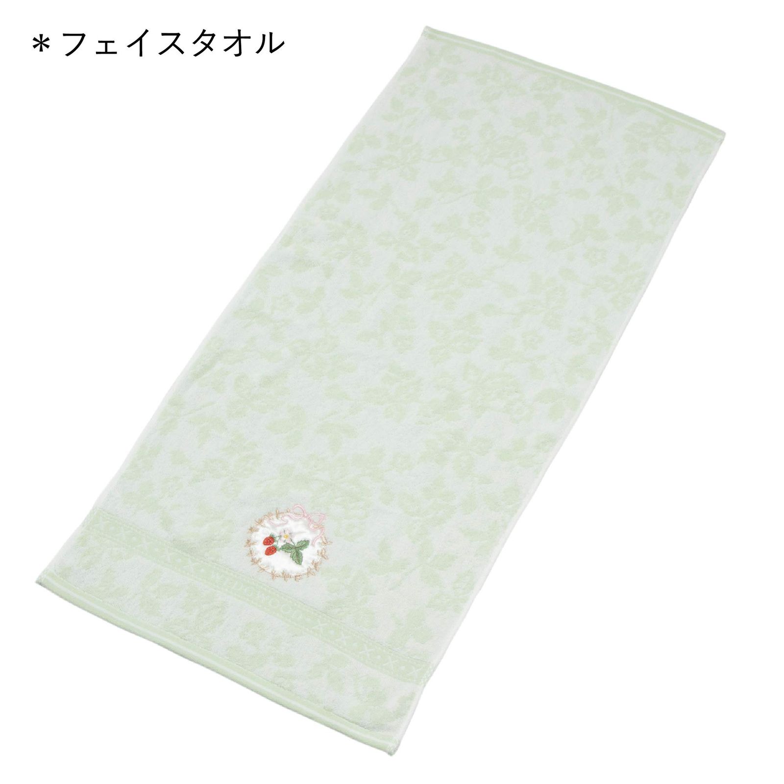 ◆野いちごを全面にあしらった華やかなタオルと、無地テイストで使いやすいタオルをセットしました。無地テイストのタオルには野いちごの刺繍をプラスしています。