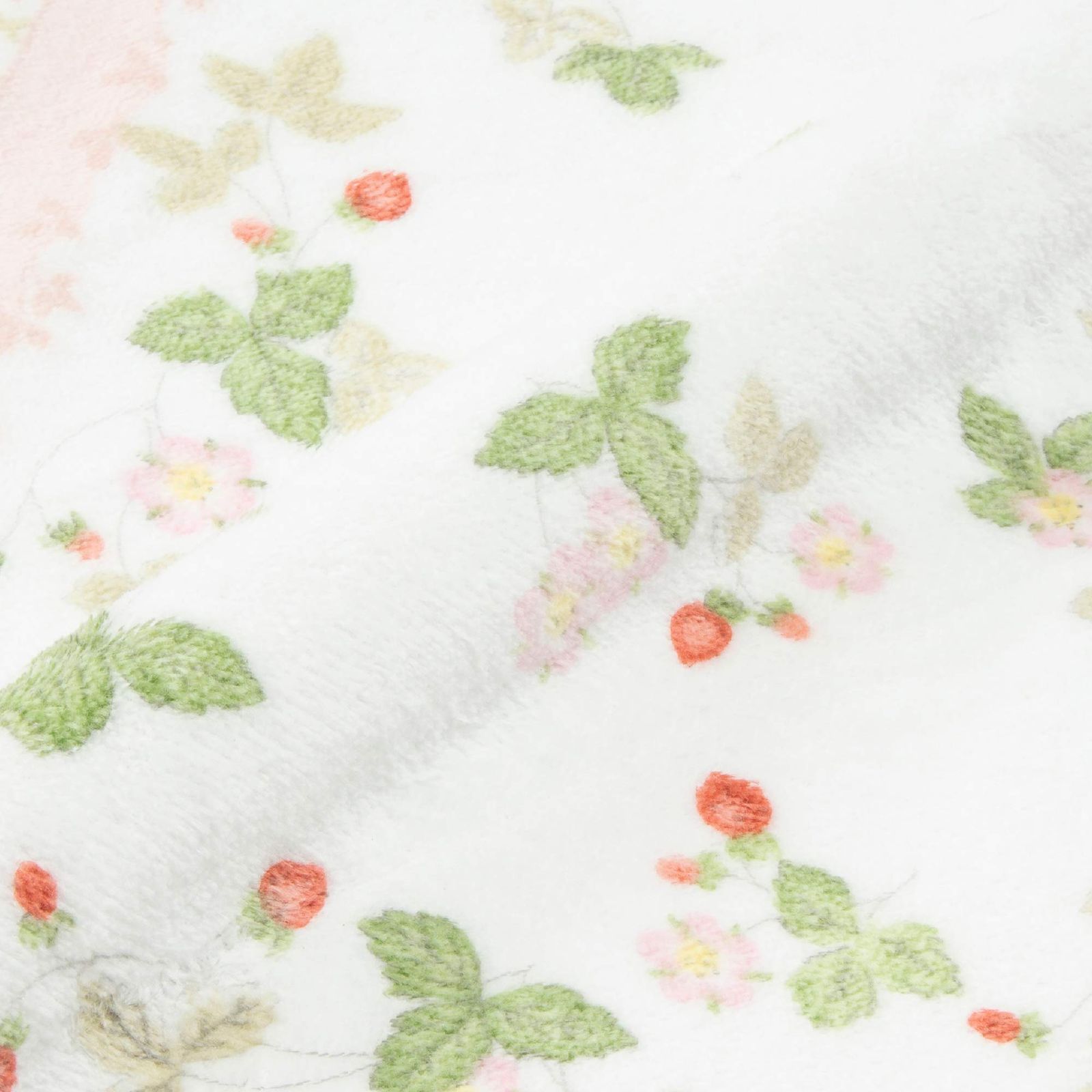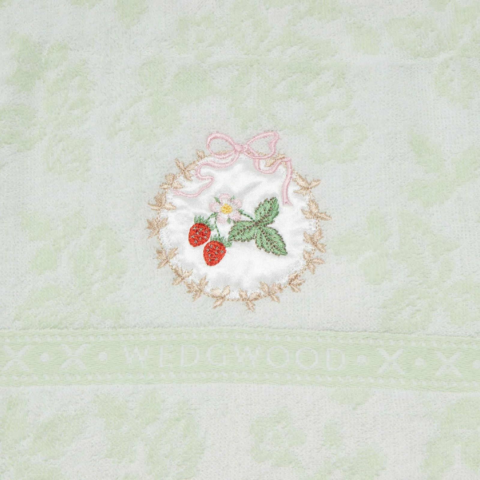 野いちごを全面にあしらった華やかなタオルと、無地テイストで使いやすいタオルをセットしました。無地テイストのタオルには野いちごの刺繍をプラスしています。