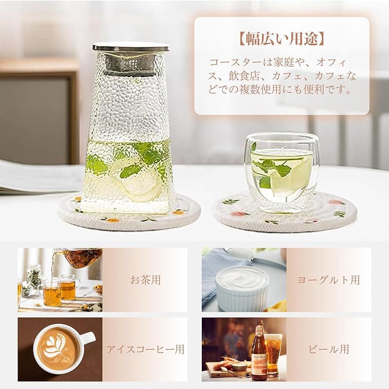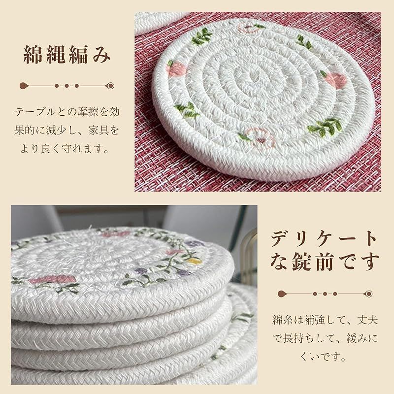【コースター】コースターは手編みで丁寧に仕上げられています。シンプルでナチュラルなデザインが、様々な場合と装飾スタイルに適用されます。 机の乾燥や清潔を保ち、湿気を防ぎ、細菌を抑えます。テーブルとの摩擦を効果的に減少し、家具をより良く守れます。