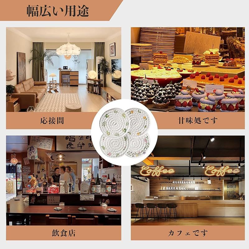 【商品のサイズ】直径:11cm、数量:4個セット、さまざまな種類のカップやグラスに対応します。使いやすい大きさで、日常使いに最適です。各種のカップを置くのにとても適しています、あなたの食事エリアに明るい色を添えます。