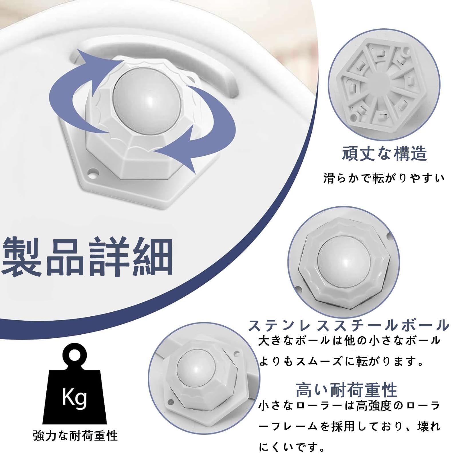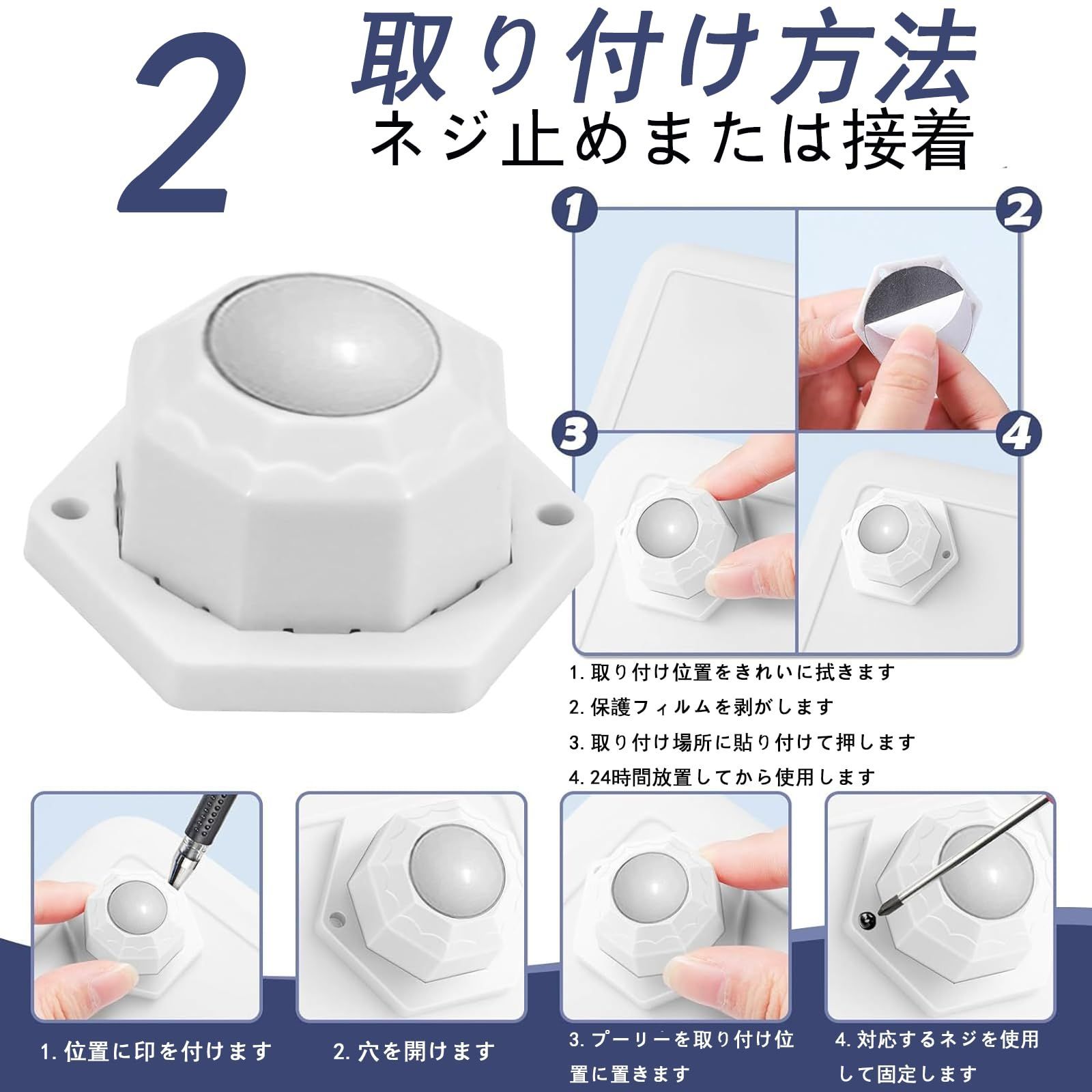 【適用場所】 このボールキャスターは、さまざまな場所で使用することができます。掃除機スタンド、収納ボックス、ゴミ箱、木の板、ラップトップ、化粧品収納、キッチン、テーブルトップ、寝室、バスルーム、リビングルーム、花棚の収納に適しています。ただし、カーペットでは使用できません。カーペットの繋ぎ目で引っ掛かる可能性があるためです。