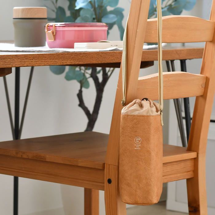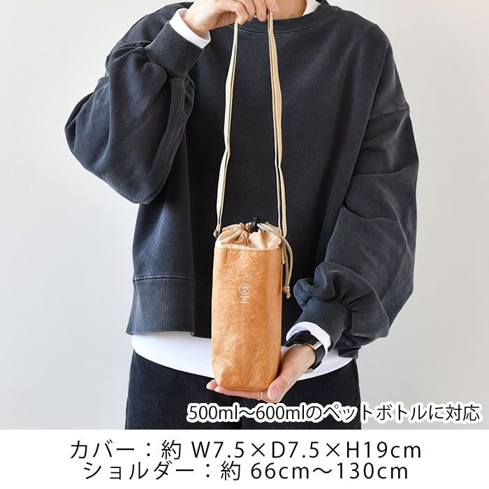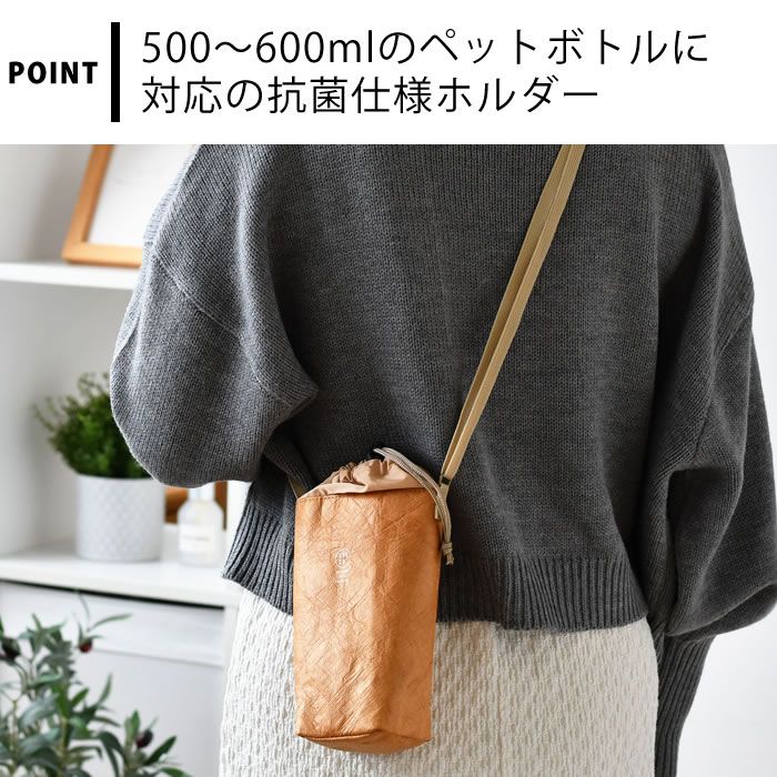 紙よりも軽くて丈夫な生地を使用した抗菌ボトルホルダー。 500~600mlのペットボトルに対応し、内側は保冷効果を補助するシルバーコーティング仕様になっています。 便利なショルダー付で便利にお使いいただけます♪