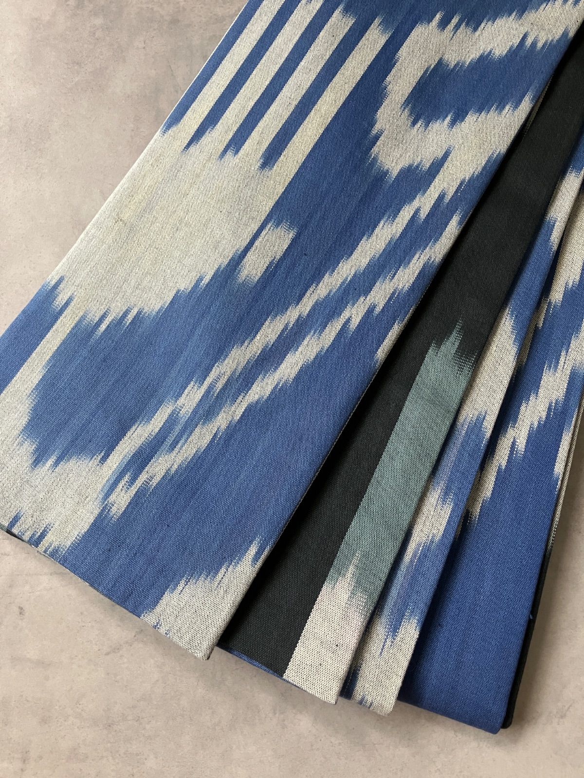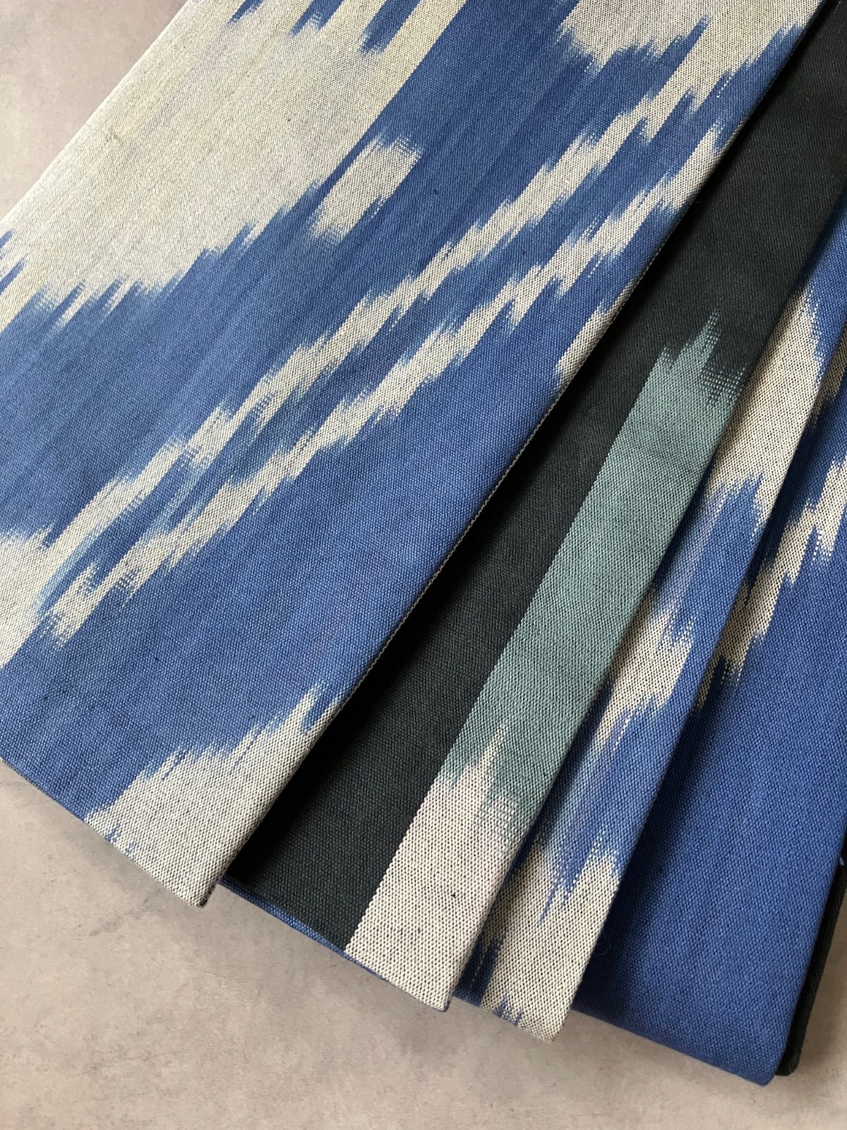 表面は、青みを帯びたグレートーンに白が織りなすシャープなイカット模様。裏面には、墨黒・灰青・グレージュが重なるストライプが配され、全く異なる表情を楽しめます。色の濃淡が繊細にぼかされており、帯結びや見せ方次第で印象がぐっと変わります。
