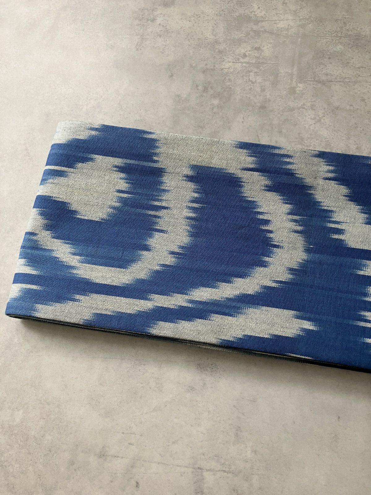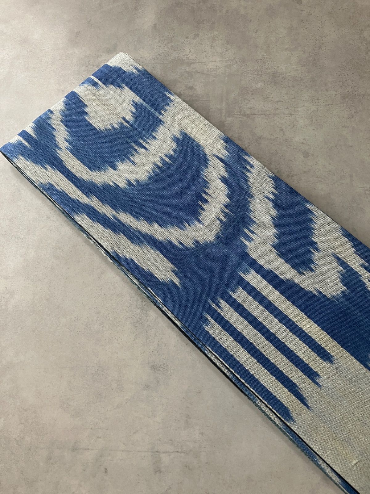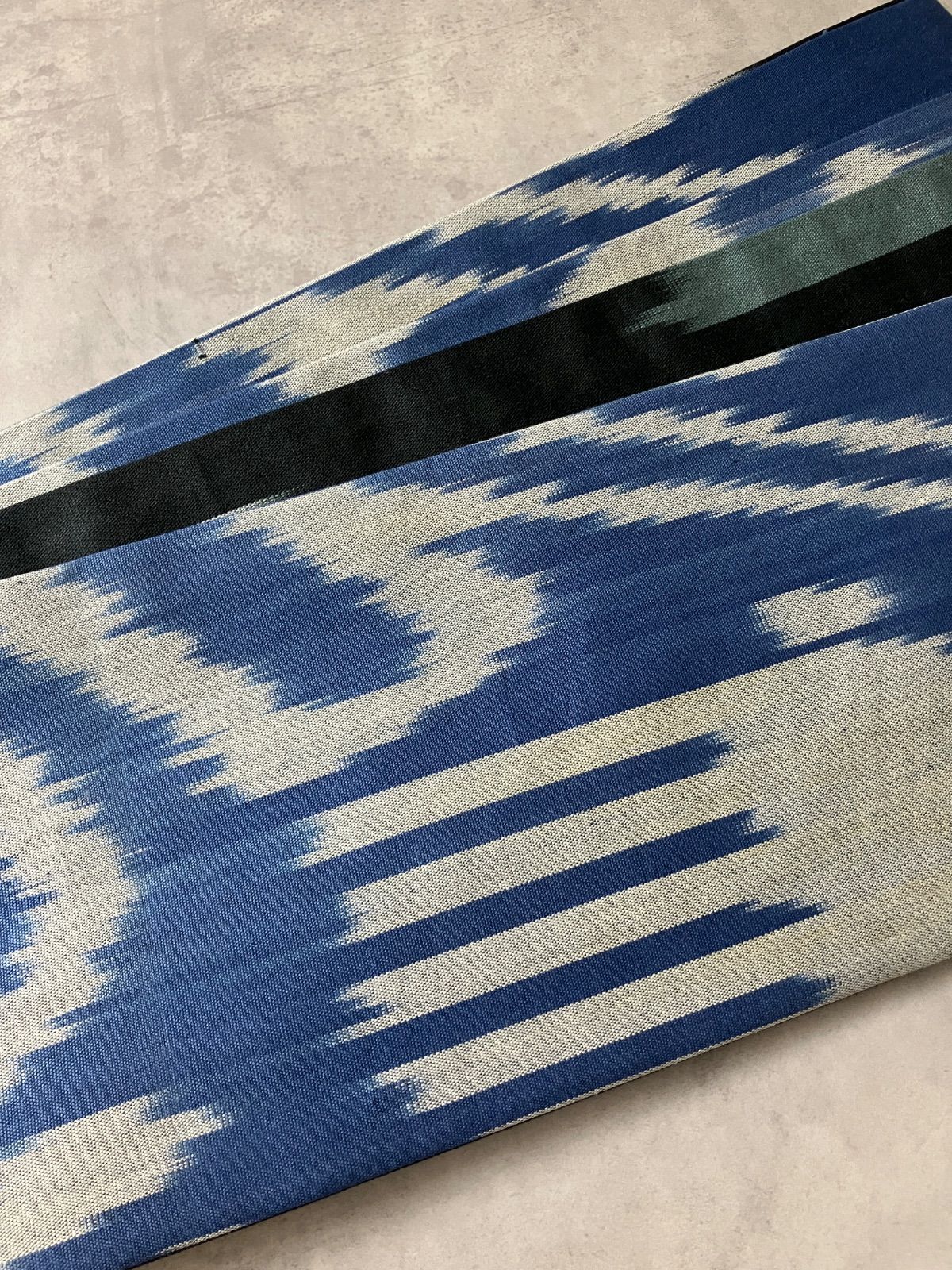 ウズベキスタンの伝統織物「アドラス」のコットンイカットを贅沢に使った、リバーシブル仕立ての半幅帯。