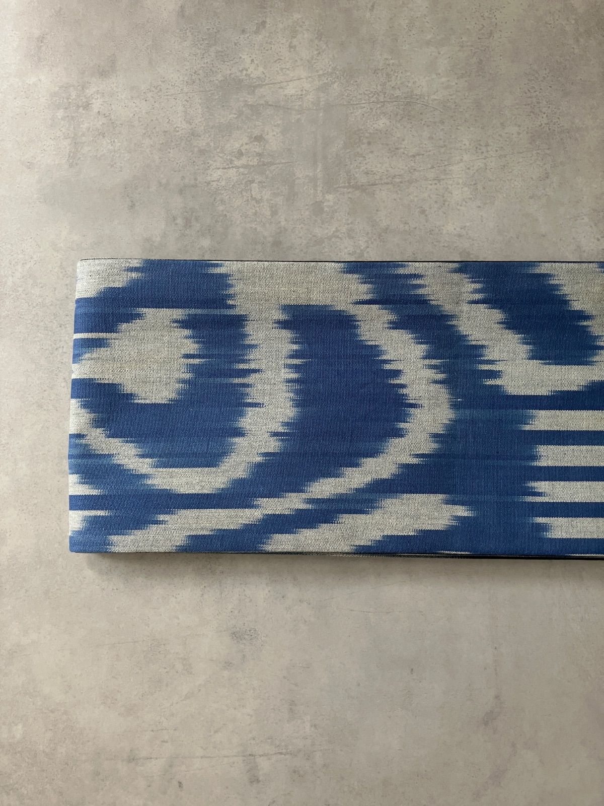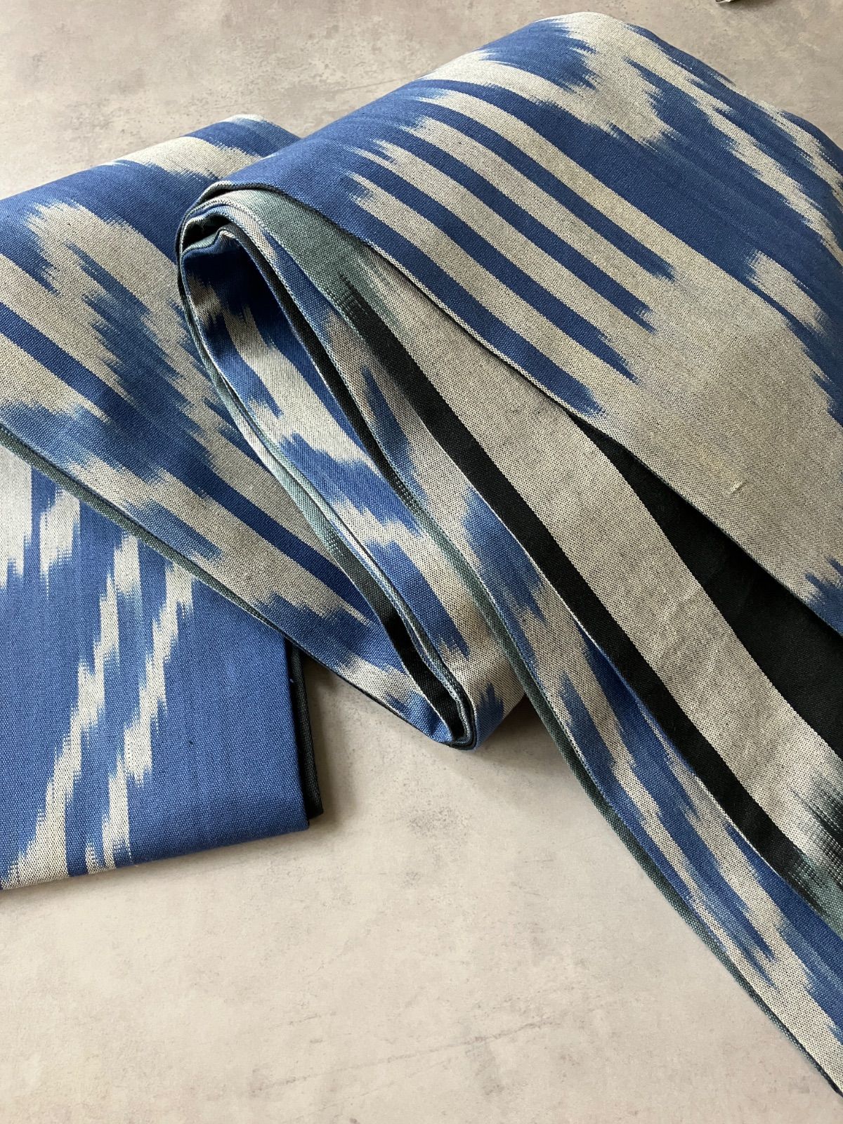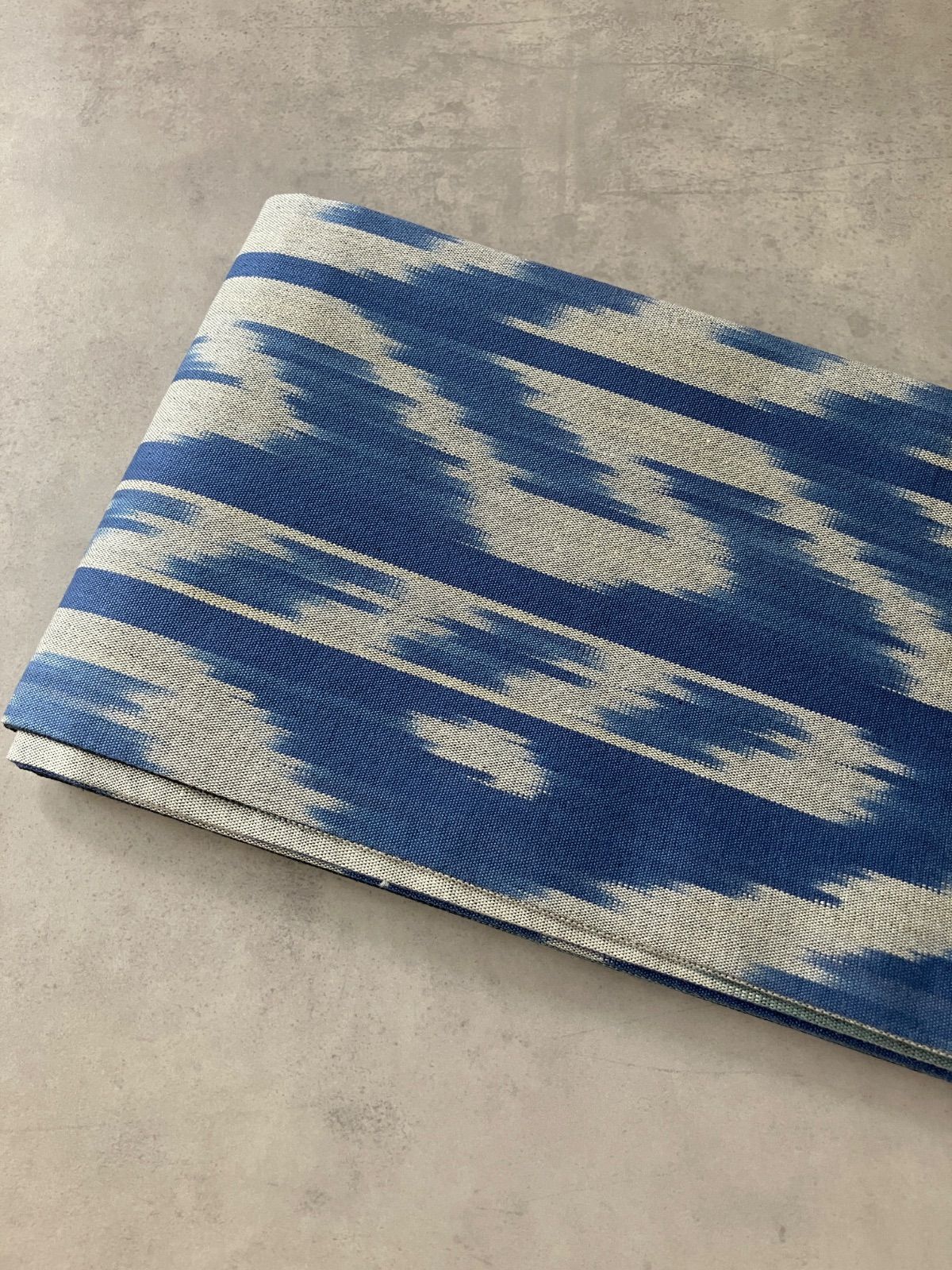 ウズベキスタンの伝統織物「アドラス」のコットンイカットを贅沢に使った、リバーシブル仕立ての半幅帯。