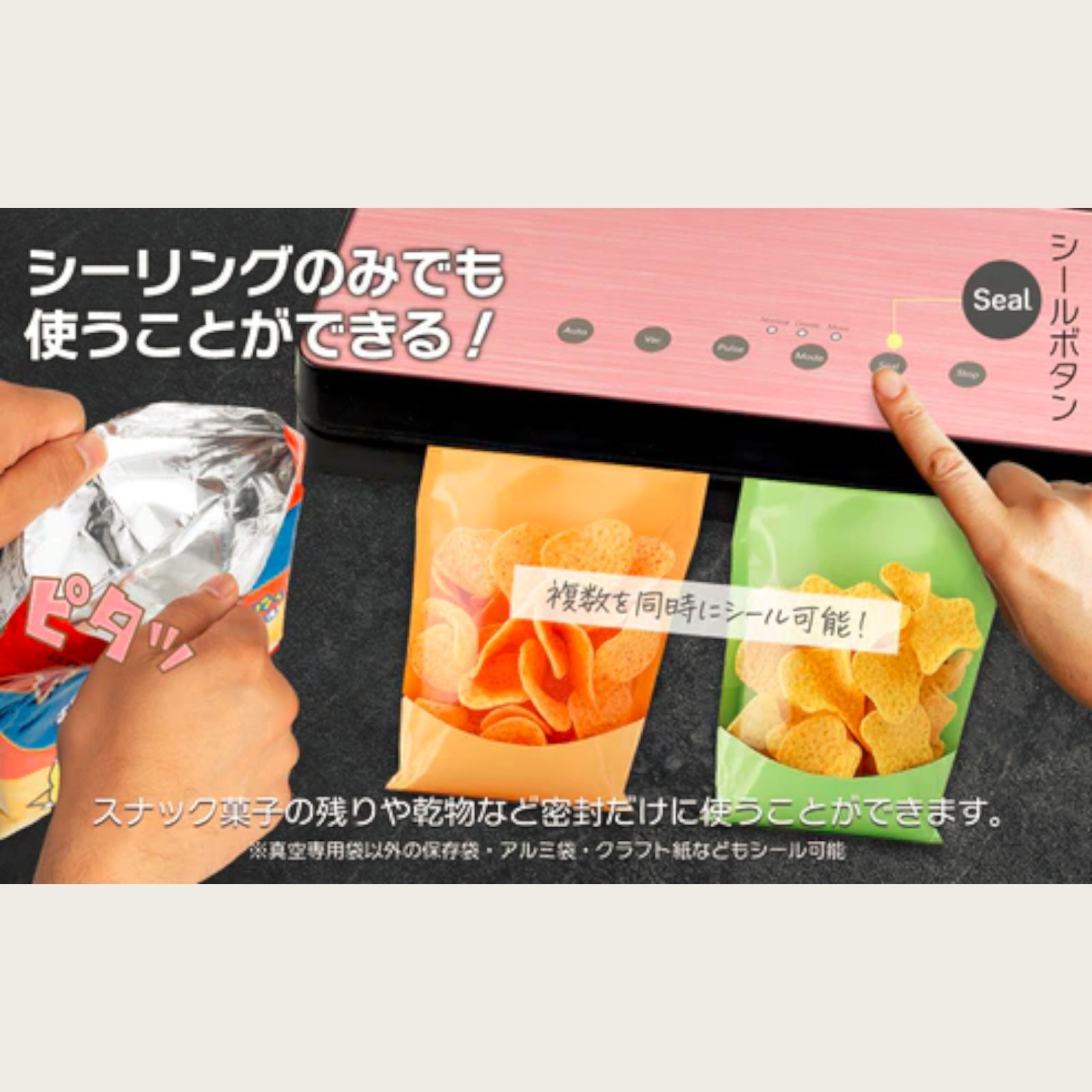 シールのみの使用も可能なので、スナック菓子の残りや乾物などの密封にだけに使う事ができます。 ※真空専用袋以外の保存袋、アルミ袋、クラフト紙などもシール可能