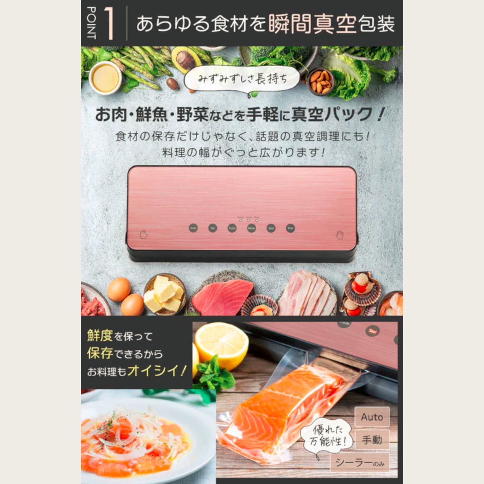 様々な食材に使用でき、肉、魚、野菜、果物などの鮮度をキープし、お菓子、ナッツなど乾燥食材などもこれ一台だけで対応可能です。