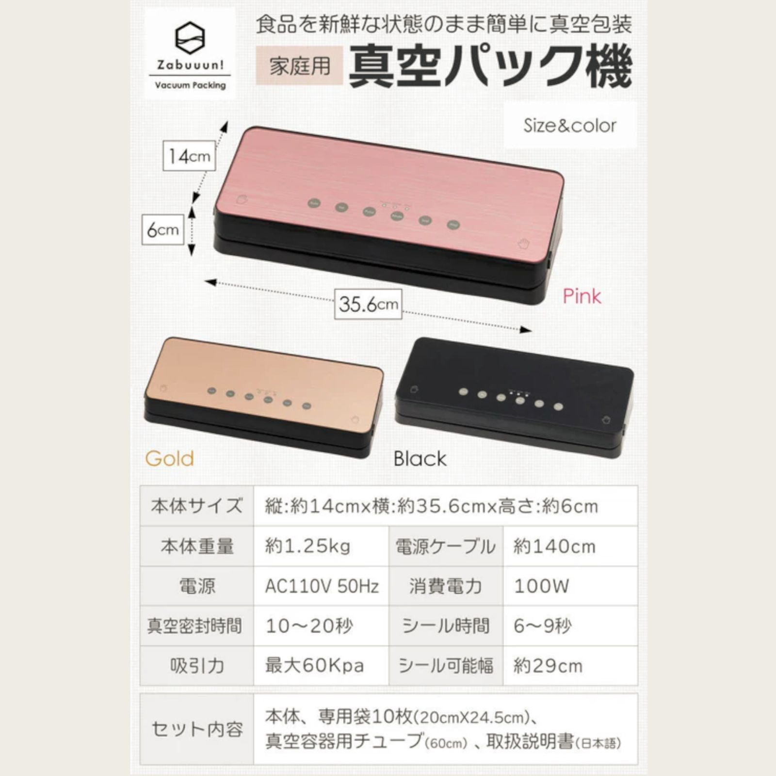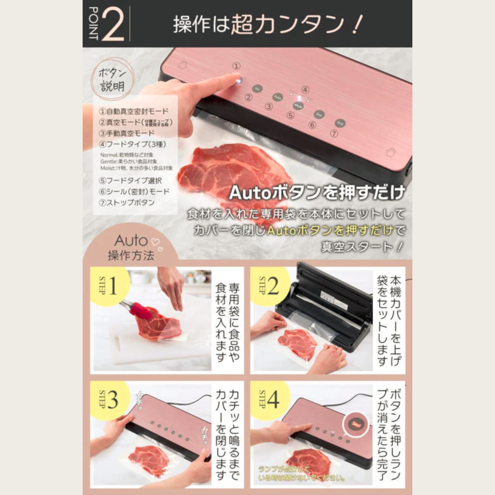 Zabuuun!真空パック機は、乾物・柔物・汁物の3モードを搭載しており、自動で真空〜密閉(シール)まで行えます。