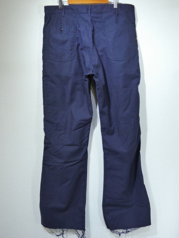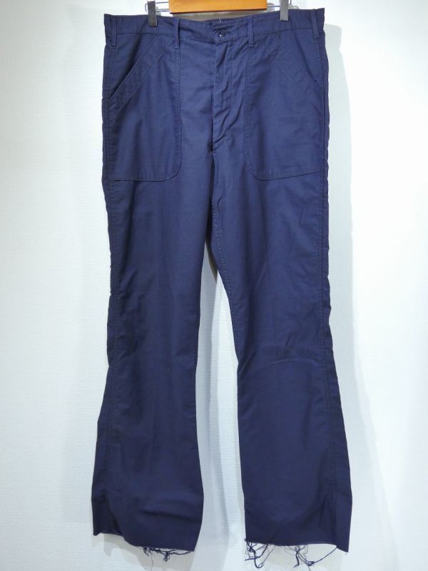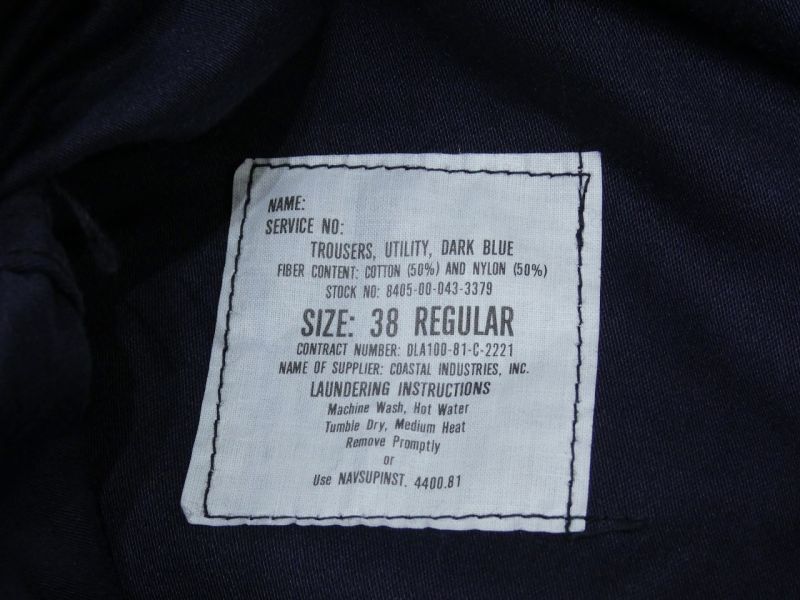 正式名はTROUSERS,UTILITY DARK BLUE で、製造はCOASTAL INDUSTRIES INC.です。US ARMYベイカーのUSN版になりますが、年代のわりに出現率が圧倒的に少ない1本になります。シルエットはフレアですが、DEAD STOCK ですので丈を詰めるとブーツカットやストレートに近いシルエットになると思います。近年、ミリタリーアイテムは世界規模で高騰が著しいです。DEAD STOCK だと尚更です。お探しだった方は是非、ご検討下さい。