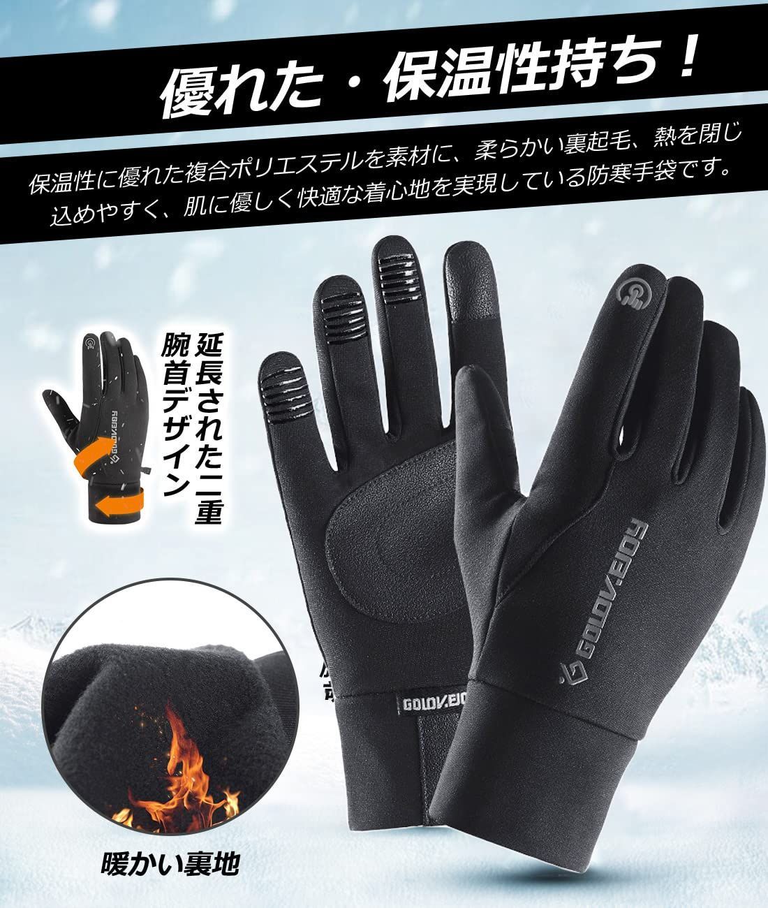 【優れた保温性持ち】男女兼用の防寒グローブで、保温性に優れた複合ポリエステルを素材に、柔らかい裏起毛、熱を閉じ込めやすく、肌に優しく快適な着心地を実現している防寒手袋です。更に、長めの丈で、袖口との隙間を作らない、手首からの冷気の侵入を防ぎ、寒い冬でもポカポカな防寒手袋で、着け心地のよくて保温性・防寒性・通気性を兼ね備えたスポーツグローブやサイクリンググローブとしても素晴らしいです。