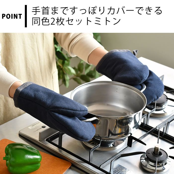 キッチンの必需品!手首までカバーできるロングミトン同色2枚セット。綿100%でしっかりとした厚みがあるので、熱いお鍋やオーブン皿にも安心してお使い頂けます♪