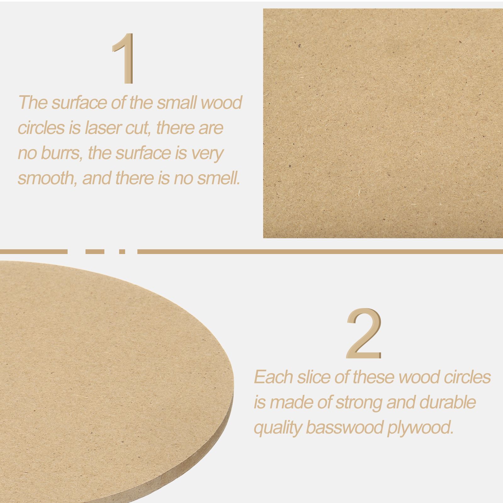 素材 - これらの木製円形板の各スライスは強固で耐久性のあるバスウッド合板で作られています。小さな木製円形板の表面はレーざーカットされており、バリがなく、表面は非常に滑らかで、くさいがありません。