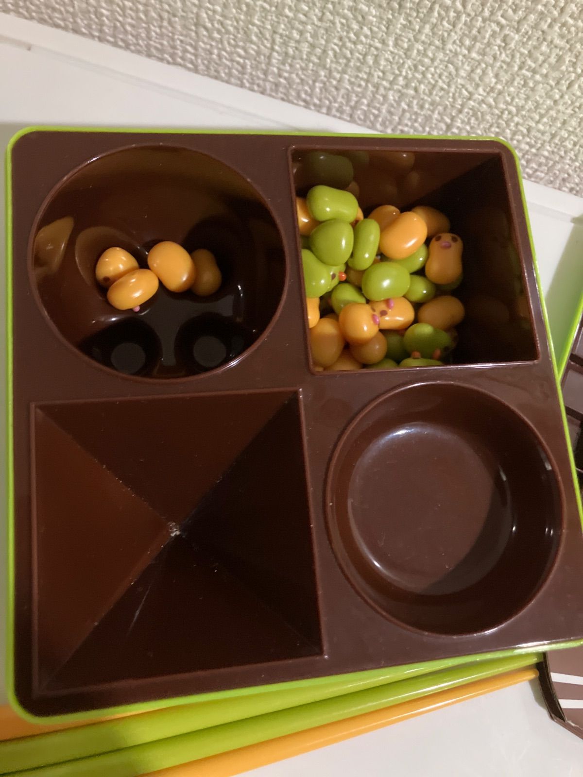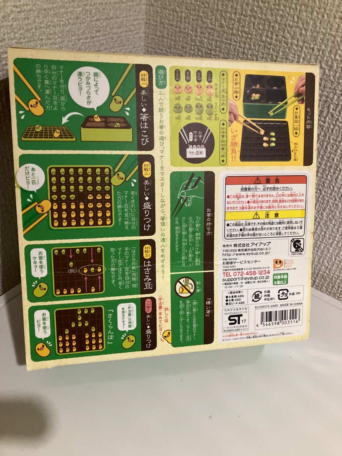 外箱は折れや破れがあり、内箱は欠品しておりますが、本体、豆50個、箸2膳、遊び方説明書は揃っております。