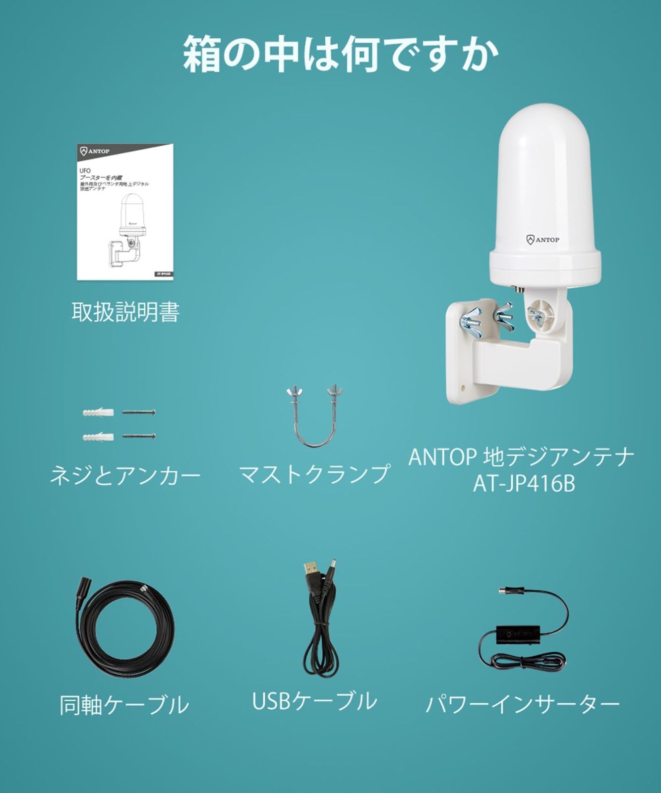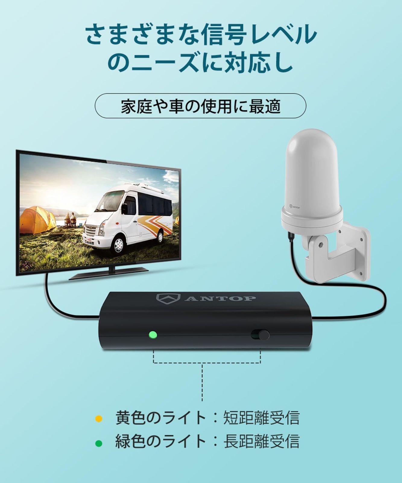 地デジアンテナ Antop テレビアンテナ 屋外 50-65KM 受信範囲 360度全方位受信 アンテナ 高性能 TVアンテナ 設置簡単 USB式 小型軽量 ブースター付き