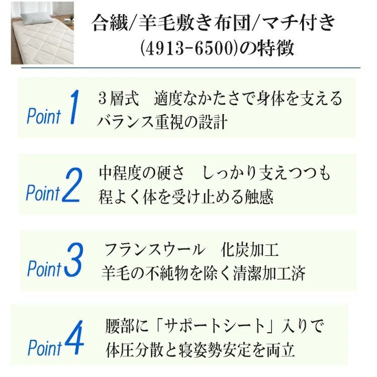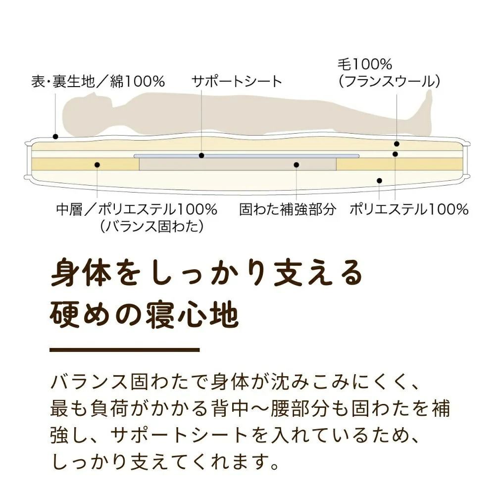 keyword:敷き布団 敷きふとん 健康敷きふとん 肩こり 腰痛 体圧分散 横向き 横向き寝 寝姿勢保持 腰痛 肩こり 疲労回復 日本製 軽い 軽量 羊毛100% 収納しやすい 干しやすい