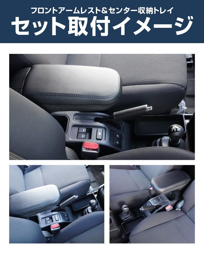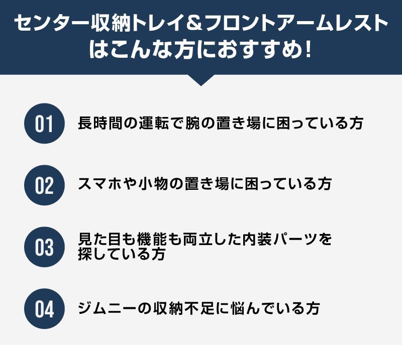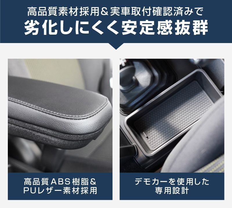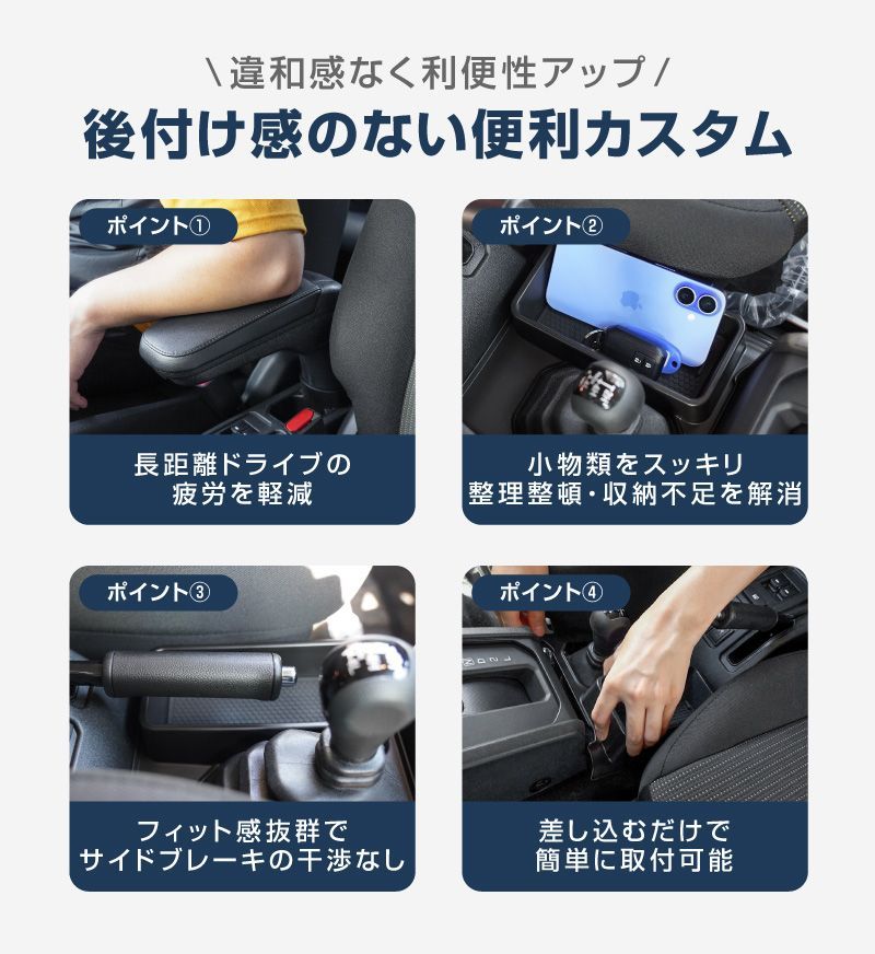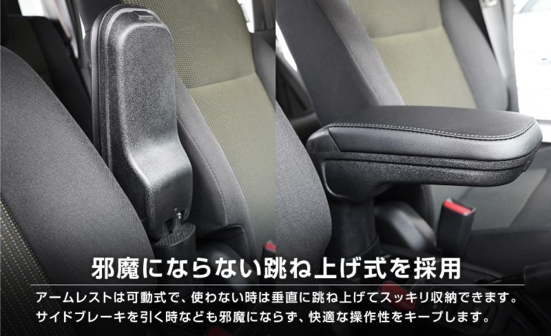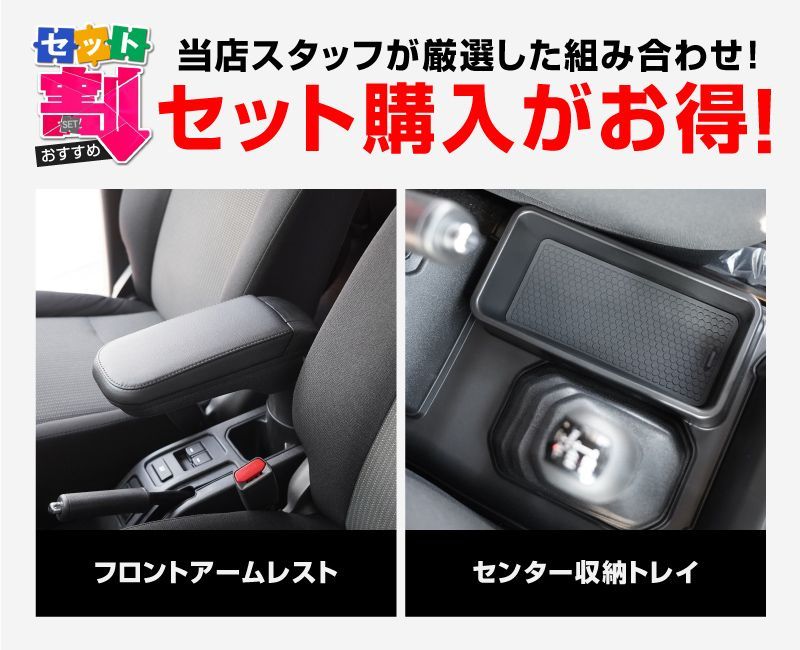 ジムニー専用設計の「アームレスト」と「トランスファーレバー収納トレイ」をセットにした快適性と実用性を両立するインテリアアイテムです。