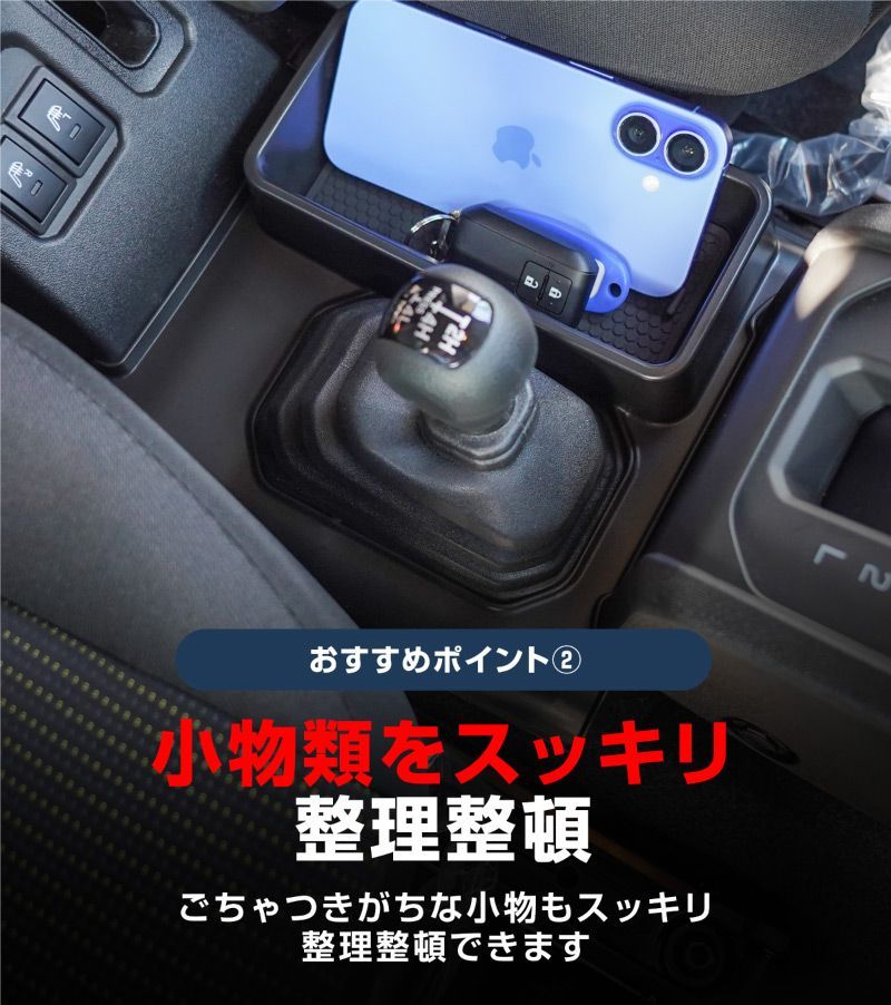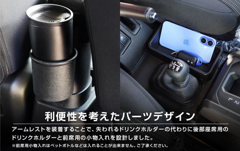内部の小物収納や後部ドリンクホルダーも備え、機能性も充実。シンプルかつ高級感あるデザインでジムニーのインテリアに自然に溶け込みます。
