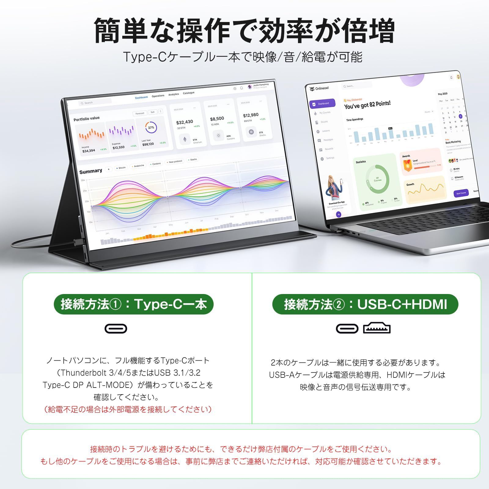 【業務効率の向上】在宅勤務やモバイルワークに最適なモバイルディスプレイです。コンパクトながらもフルHDの解像度で、作業領域を拡大し業務効率を向上させます。使い終わった後も片付けが簡単で、場所を取りません。